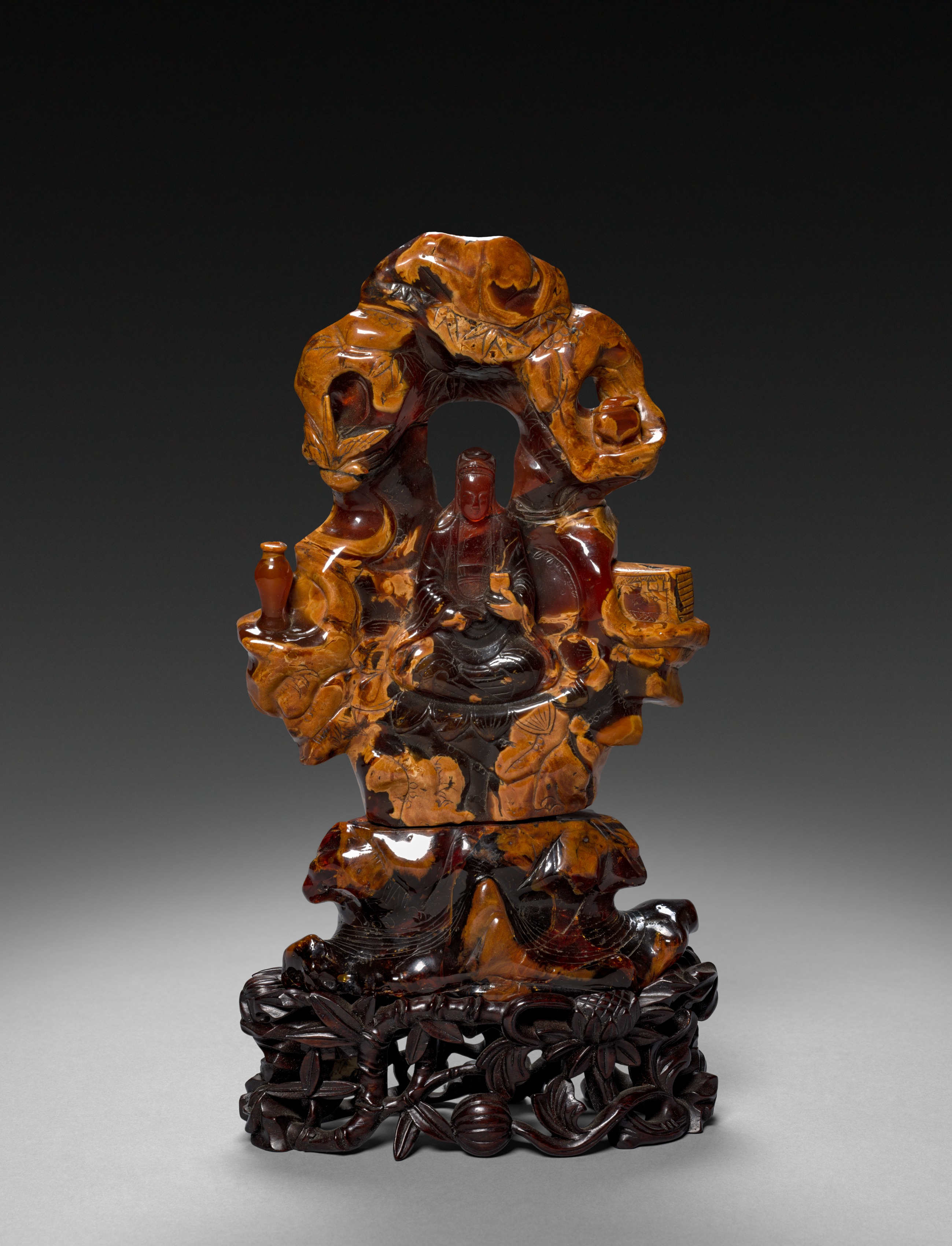 The sculpture depicts Bodhisattva Guanyin seated on a rocky base surrounded by curved vines. Guanyin sits cross-legged on a lotus throne, adorned in flowing robes with intricate patterns. The figure's right hand holds a small vase. The sculpture is made of a polished material, likely amber or a similar resin, exhibiting a rich brown color with darker undertones. A curved, hollowed-out rocky structure rises behind Guanyin, adorned with carved vines and leaves. The base features coiled vines. The background transitions from dark at the top to light gray at the bottom.