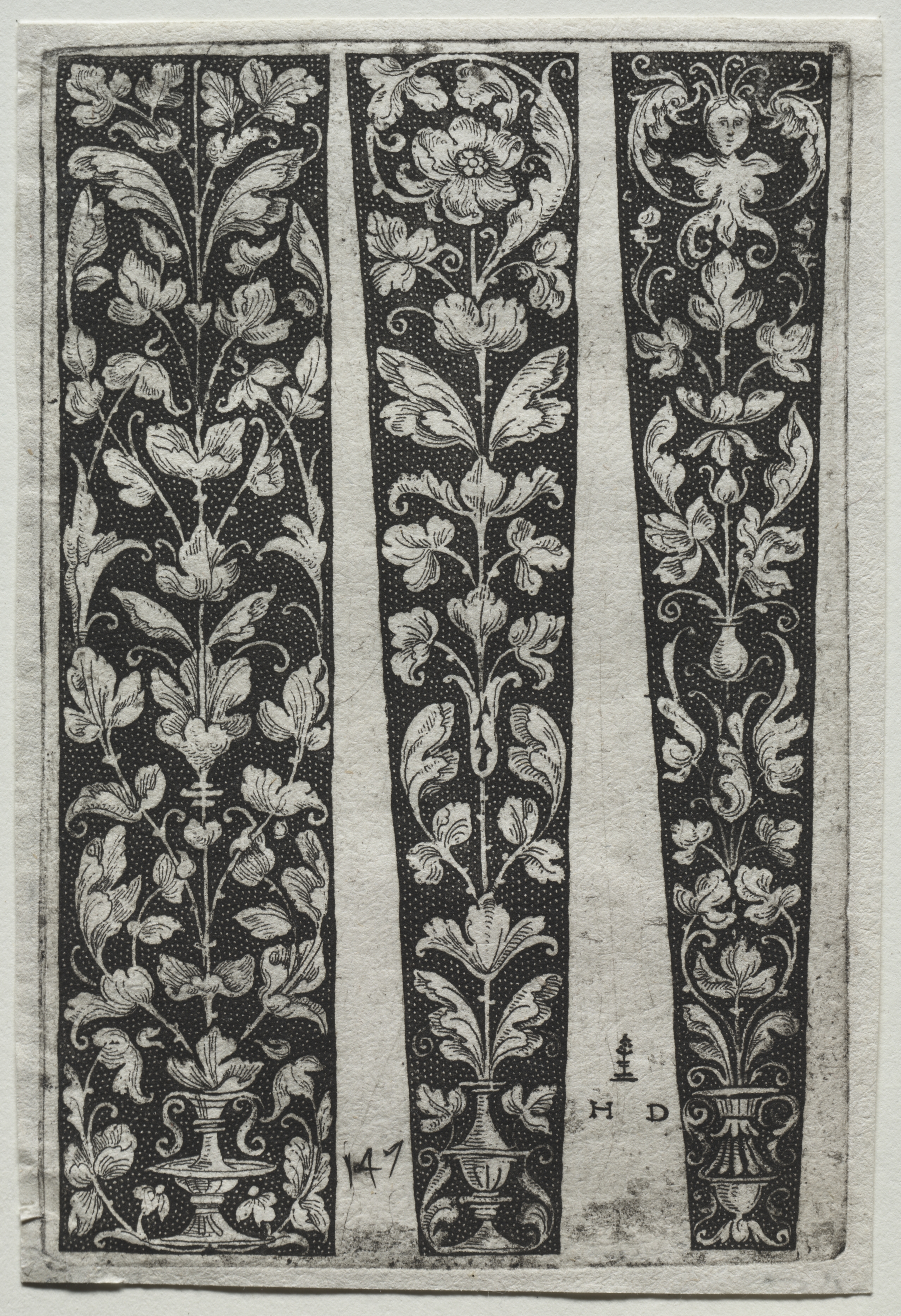 Black and white image, rectangular with rough texture; three vertical panels; floral designs on dark background with small white dots; panels separated by thin light strips; each panel features a central pot or vase; curled leaves and flowers; 'HD' and '147' handwritten in bottom panel; pot on right with curled leaves and figure at top; pots on left and center with curled leaves and flowers. Ornament Fillet by Daniel Hopfer.