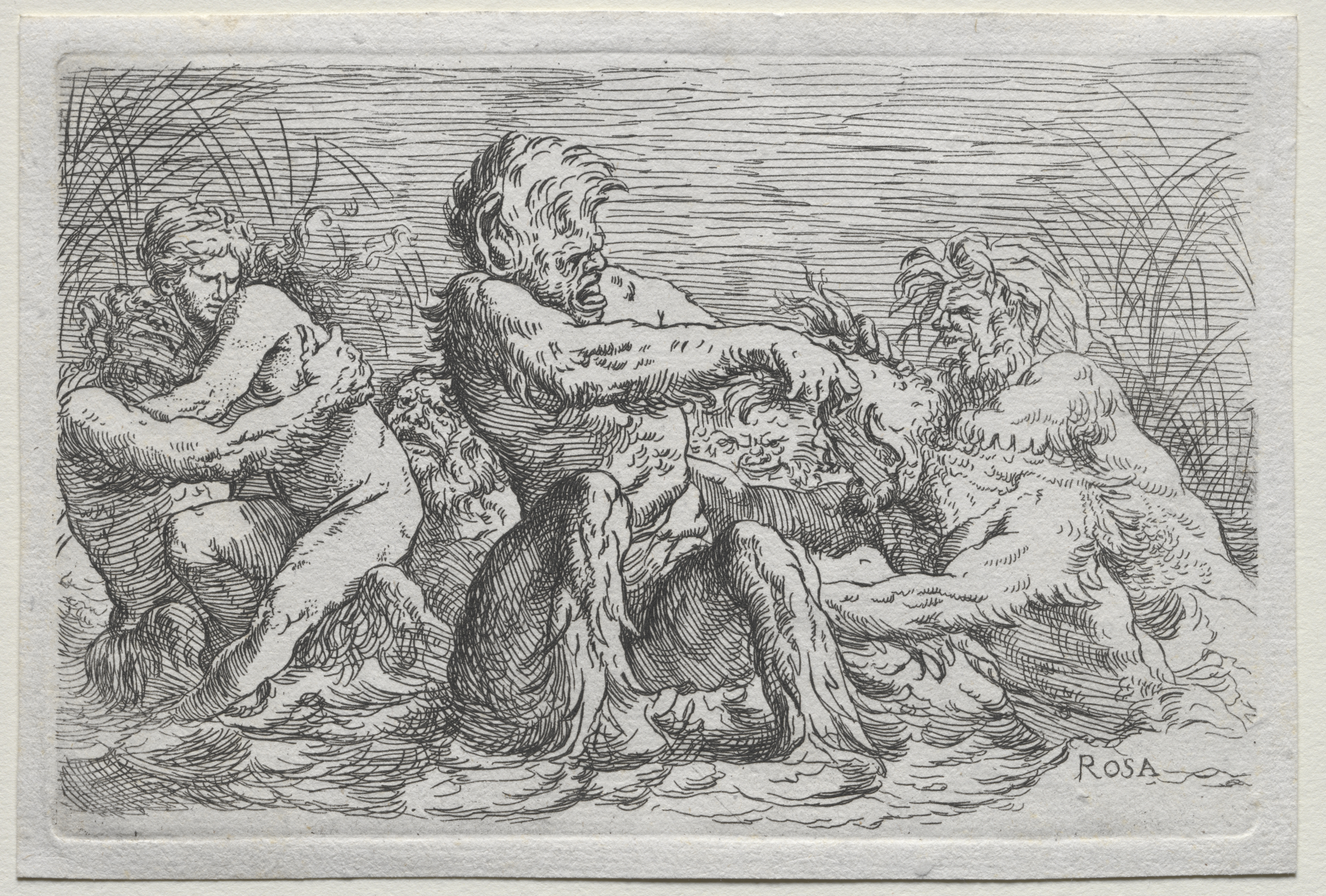 Black and white drawing of three muscular men wrestling in a body of water. The man in the middle is kneeling. The man on the left sits on a rock, one leg tucked under the other. The man on the right sits on the right edge, upper body outside of the water. All three have long hair. The artist's signature, "ROSA," is on the bottom right. The background shows horizontal lines for the sky with curved lines on the sides suggesting vegetation. The image is rectangular with a raised border on the paper.