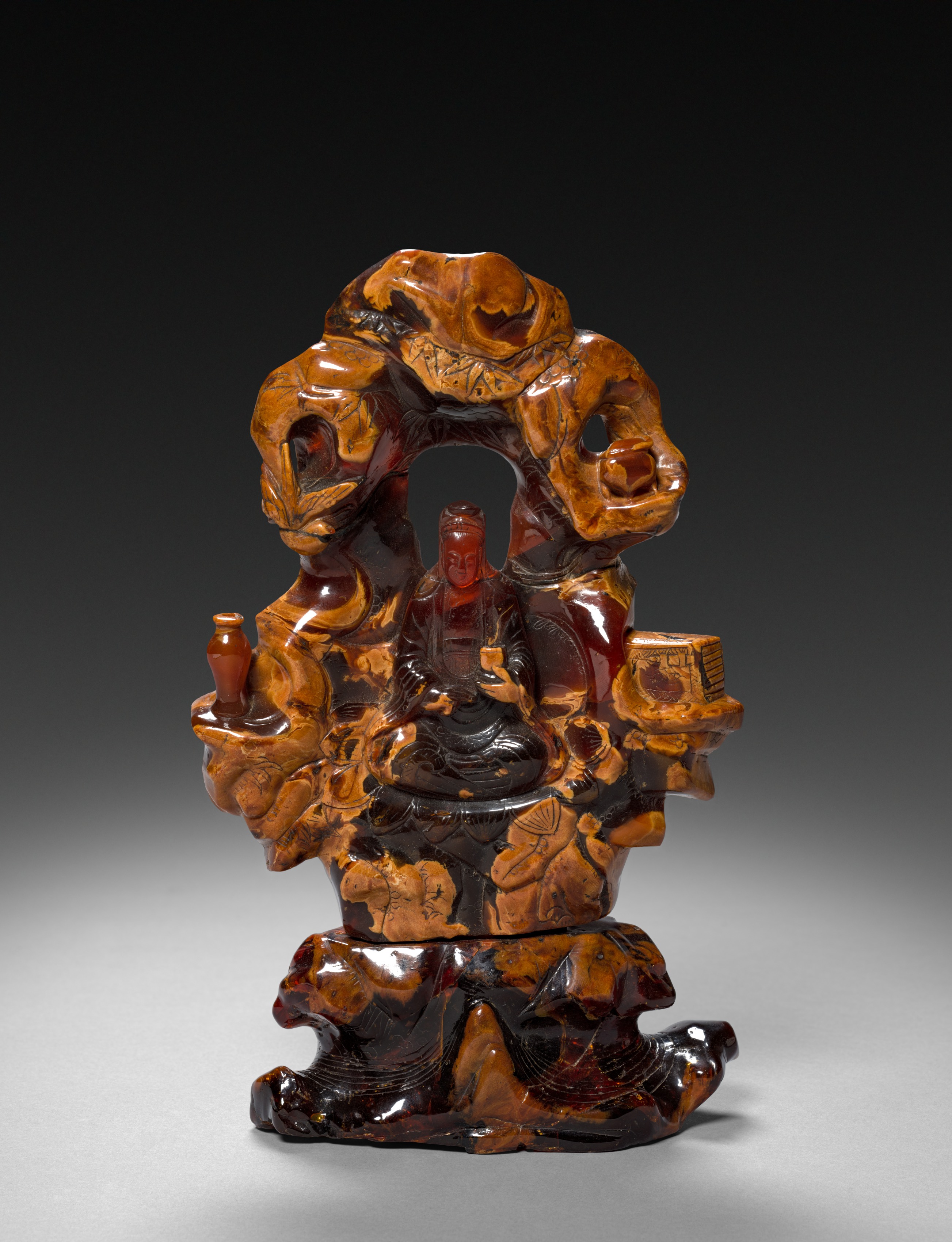 Bodhisattva Guanyin seated in a rock grove, by an unknown artist, is a sculpture carved from a dark brown and orange stone. The sculpture depicts a figure of a woman sitting on a base with their legs crossed. The woman wears a long robe, and her right hand rests on her knee while her left hand holds an object. She sits within an archway formed by a grove of intricately carved tree roots. The base features carvings of waves. To the left of the woman is a small bottle on a ledge, and to the right is a box on a ledge. The background of the image transitions from black at the top to light gray at the bottom.