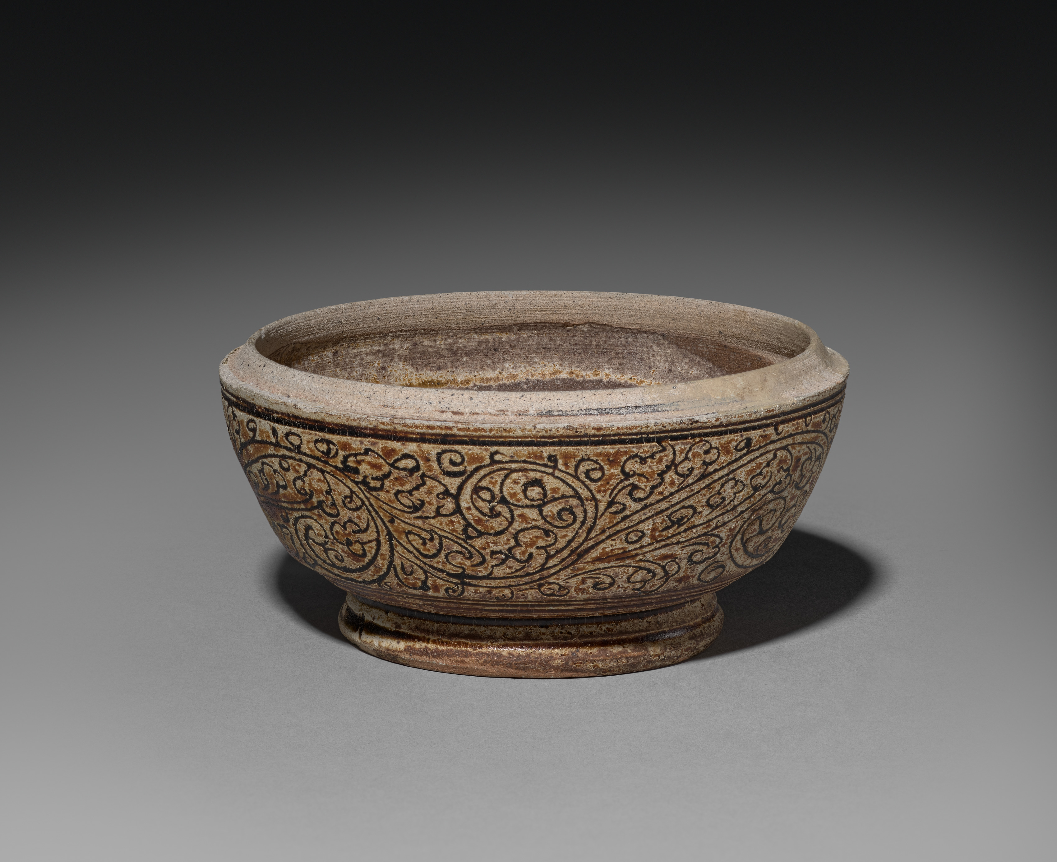 The ceramic jar has a wide mouth and a short foot. The body is decorated with a black design on a beige background with brown undertones. The design features scrolling lines and circular shapes. A horizontal line encircles the top and bottom of the design. The inside of the jar is glazed with a darker brown color. The jar appears to be Sawankhalok ware, a type of Thai ceramic.
