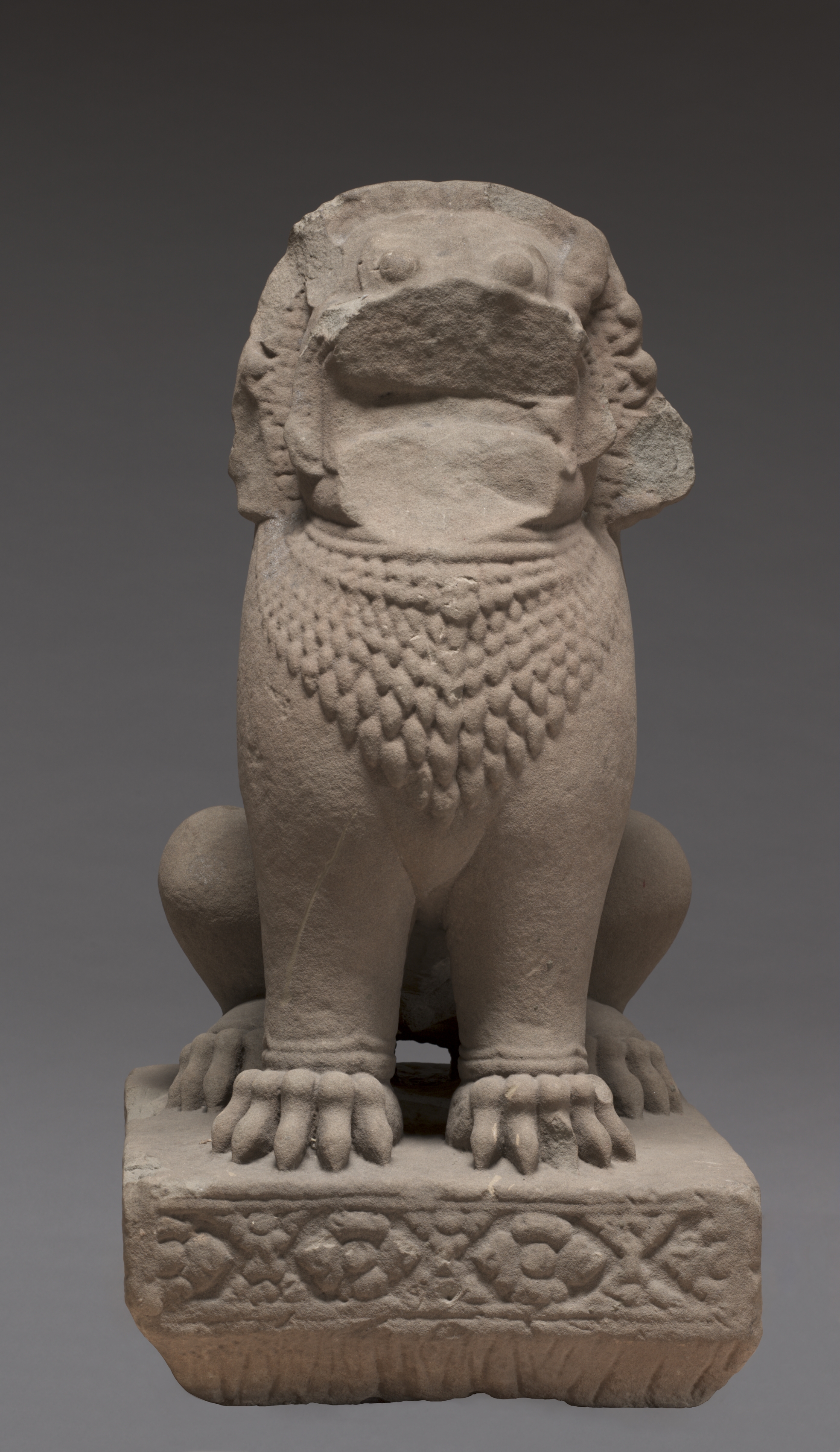 The sculpture depicts a crouching lion with a large head, prominent snout, and visible teeth. The lion's body is rendered in a light brown stone, with a textured mane around its neck and chest. Its front legs are positioned under its body, while its back legs are bent and not visible from the front. The lion's paws have five toes with sharp claws. A decorative base features geometric patterns and supports the lion. The background is a gradient of dark gray to light gray. The lion is by an unknown artist and is titled "Lion".