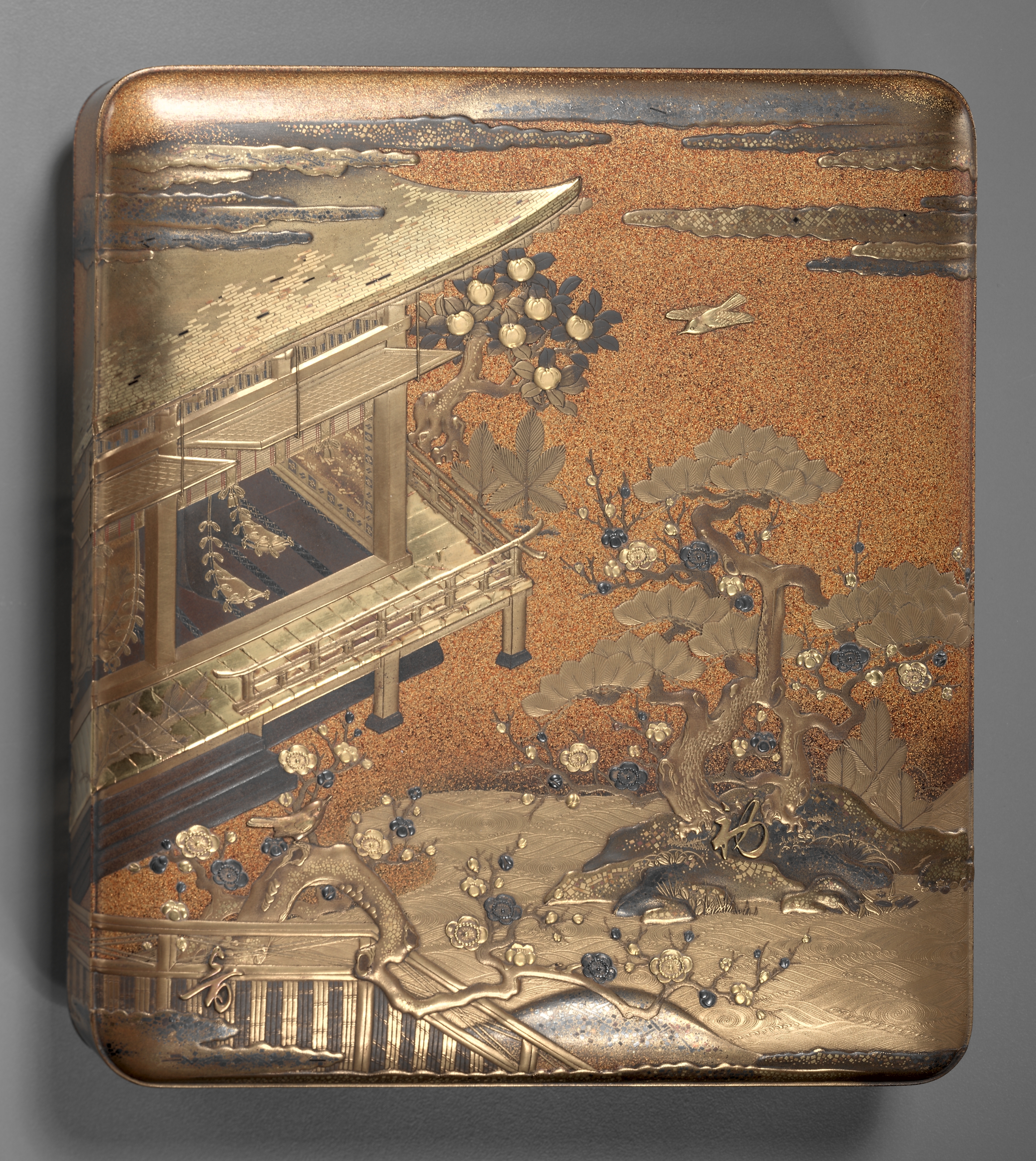 Rectangular box with rounded corners. The box depicts a Japanese building with a tiled roof and a balcony overlooking water. A tree with flowers is on the right. A bird flies near the top right corner. The background is orange-brown with a stippled texture. Blue and white flowers and foliage are scattered throughout. A fence runs along the bottom. The box has a raised edge and is made of a shiny material, possibly metal.