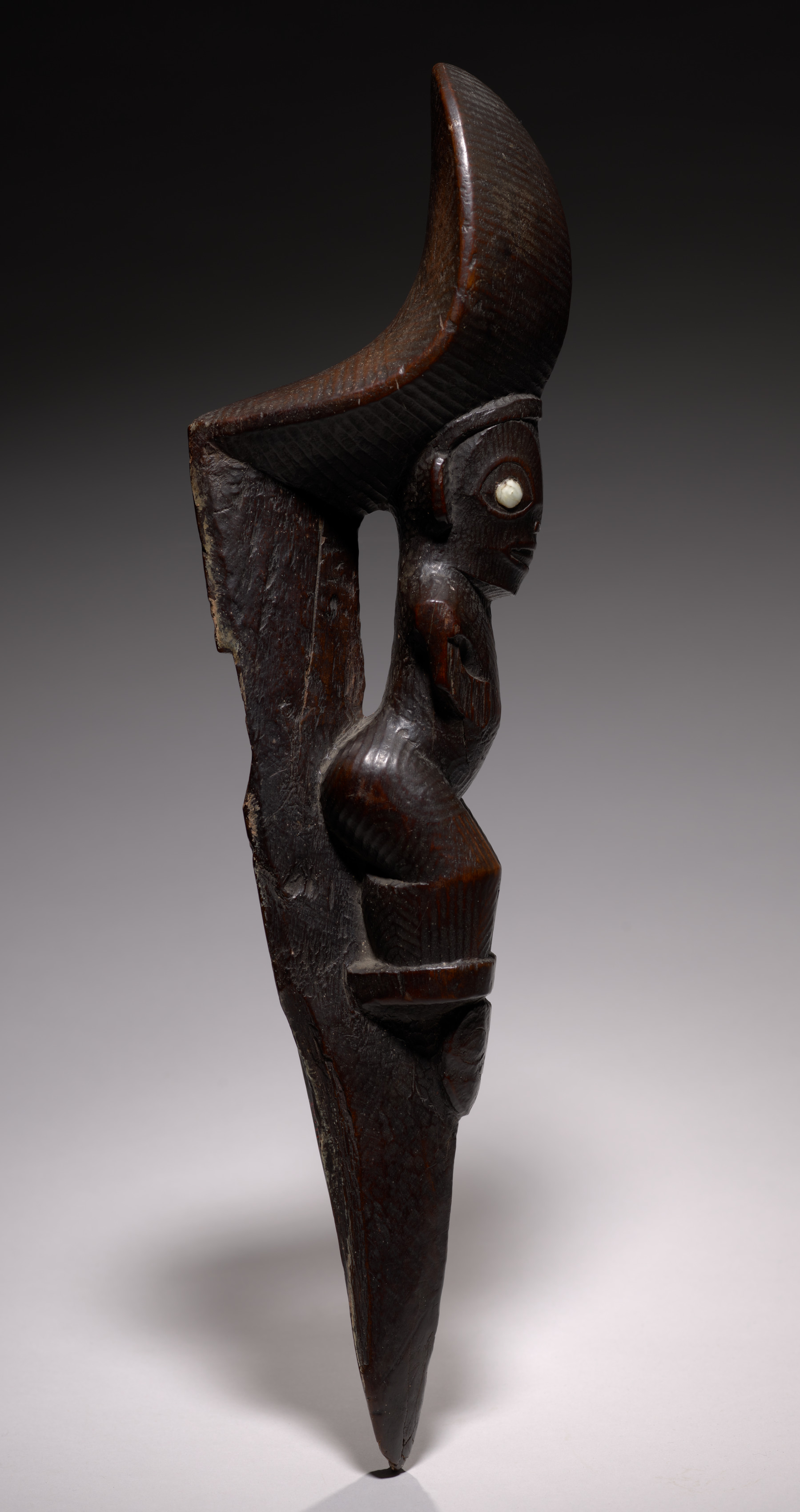 Dark brown wooden sculpture, titled "Stilt Footrest", created by an unknown artist. The sculpture is tall and thin with a pointed base. A face with a large nose and a white circular object for an eye is carved on one side. A curved piece of wood protrudes from the top of the face. A protruding object with a cylindrical base and a conical top is carved below the face. The background is dark at the top and light at the bottom, with the sculpture casting a shadow.