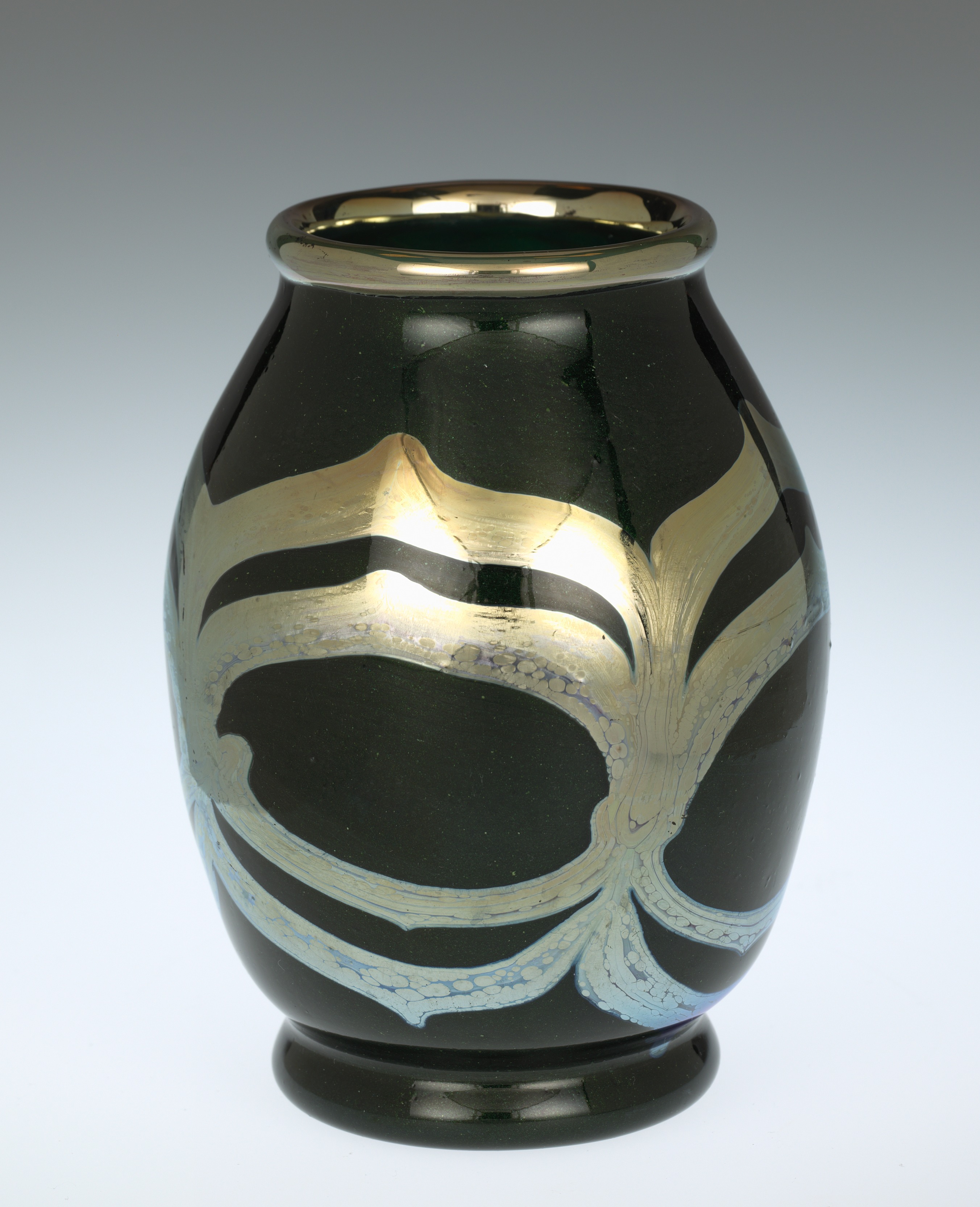 The vase is black with a wide mouth and narrow base. The rim of the vase is gold-colored and shiny. There are gold and light blue wavy lines on the body of the vase. The lines are thicker at the bottom and thinner at the top. The background of the image is gray and white, with the vase sitting on a white surface. The overall style of the vase is Art Nouveau. Louis Comfort Tiffany is the artist. The piece is titled "Vase".