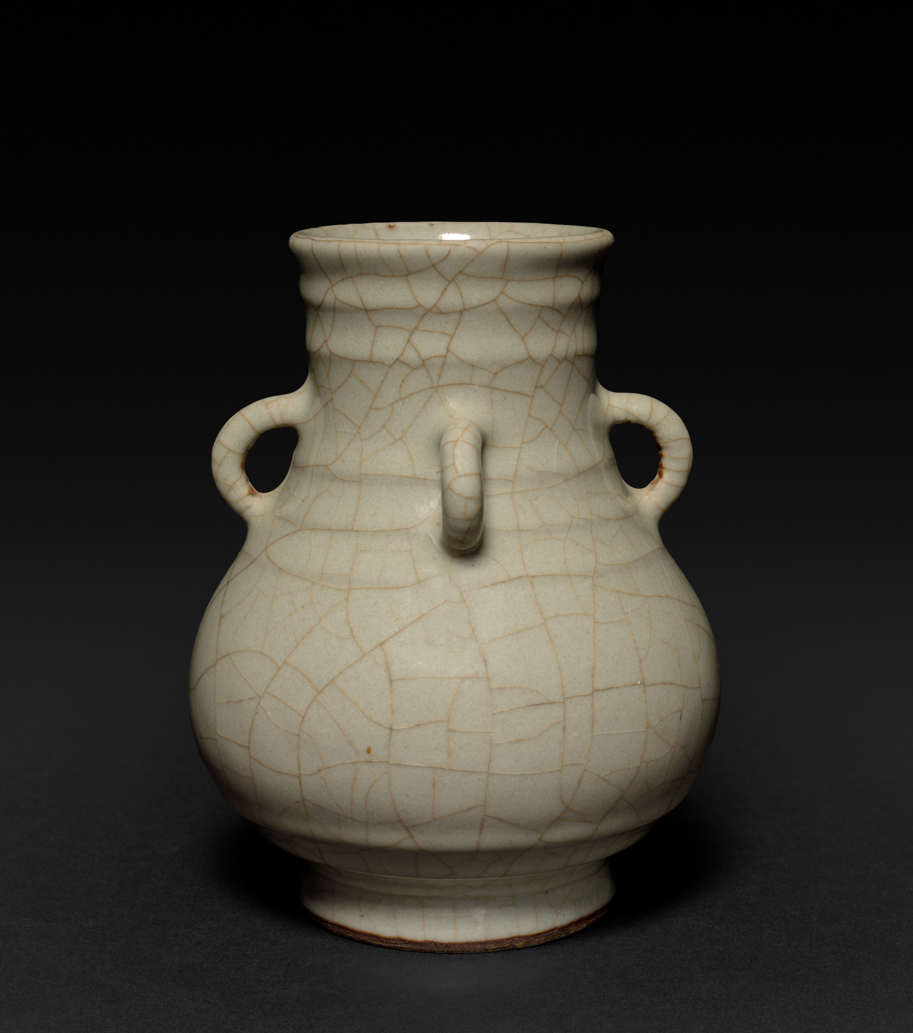 The vase, titled "Vase: Guan type", by an unknown artist, is a ceramic piece featuring a predominantly white body with a crackled pattern in a darker, reddish-brown hue. The vase has a rounded body that bulges out in the middle, tapering slightly towards the top and bottom. It stands on a short foot and has a wide mouth. Two small loop handles are positioned on either side of the body. The glaze exhibits a crackle pattern throughout. The background of the image is dark, which highlights the details of the vase.