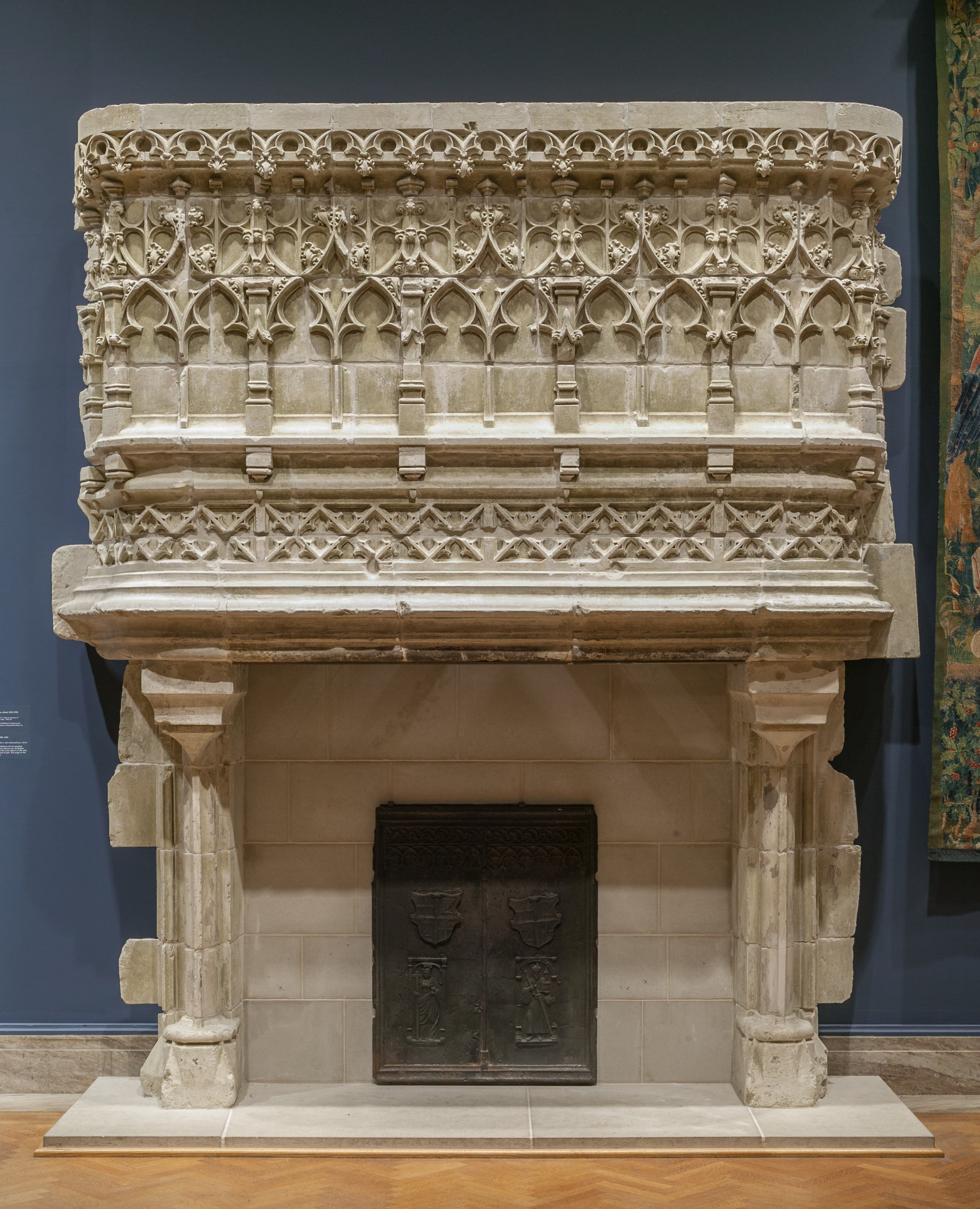 The Chimney Piece by Robert de Luzarches features a large stone fireplace with a decorative top. The top section has a flat surface with intricate carvings of repeating pointed arch shapes and floral motifs, all in a light-colored stone. Two rows of small columns support the top section. Below the carved top, there is a flat ledge. The fireplace opening has a dark metal door with a raised design. The sides of the fireplace have short stone columns on square bases. The background is a dark blue wall, and to the right is the edge of a tapestry. The floor is wooden with a herringbone pattern.