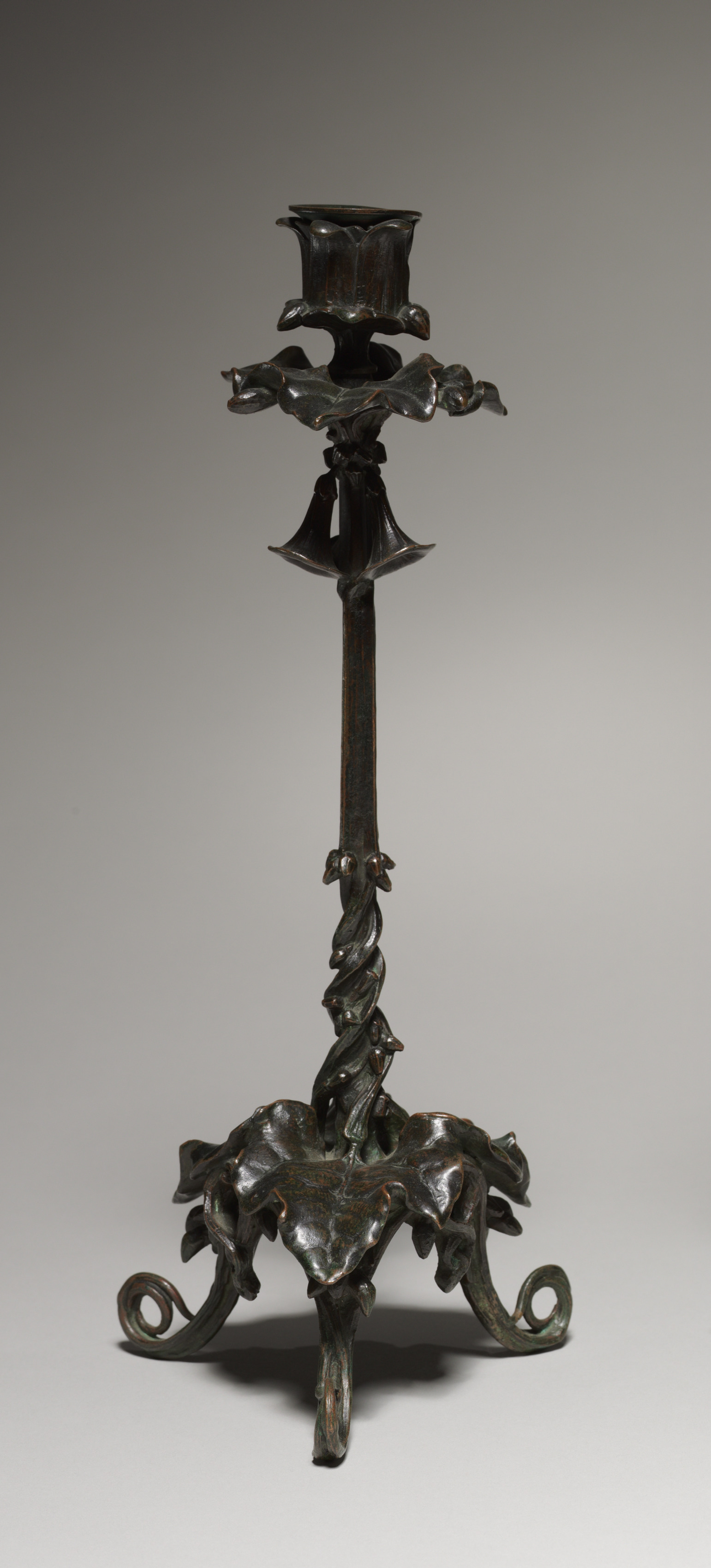 The candlestick is made of dark metal with a greenish patina. It features a slender, twisted stem. The base has four curved legs with scroll-like ends, connected by curved pieces. A leaf-like design adorns the center of the base. Three curved supports extend from the stem, each featuring two birds, one on each side, with their heads facing outward. The top of the candlestick has a flared, scalloped edge. A flared, bell-shaped piece is positioned below the top. The background is gray. "Candlestick" by Antoine-Louis Barye.