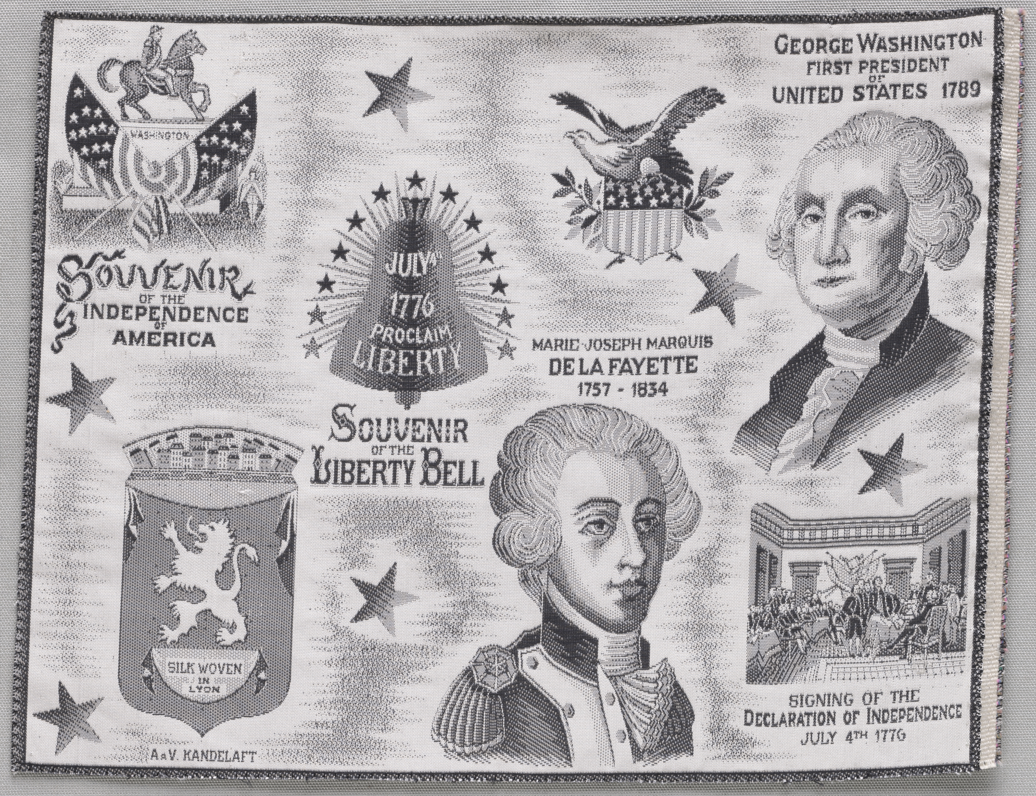 Black and white rectangular fabric with a dark border. The top left features an American flag with a horse on it and the words "SOUVENIR OF THE INDEPENDENCE OF AMERICA". The top center shows a bell with "JULY 1776 PROCLAIM LIBERTY" and "SOUVENIR OF THE LIBERTY BELL" below it. The top right displays a portrait of George Washington with the text "GEORGE WASHINGTON FIRST PRESIDENT OF UNITED STATES 1789". The bottom left features a shield with a lion and the words "SILK WOVEN IN LYON". The bottom center shows a portrait of Marie Joseph Marquis de La Fayette with the text "MARIE JOSEPH MARQUIS DE LA FAYETTE 1757 - 1834". The bottom right depicts a scene with people and the text "SIGNING OF THE DECLARATION OF INDEPENDENCE JULY 4TH 1776". Stars are scattered throughout.
