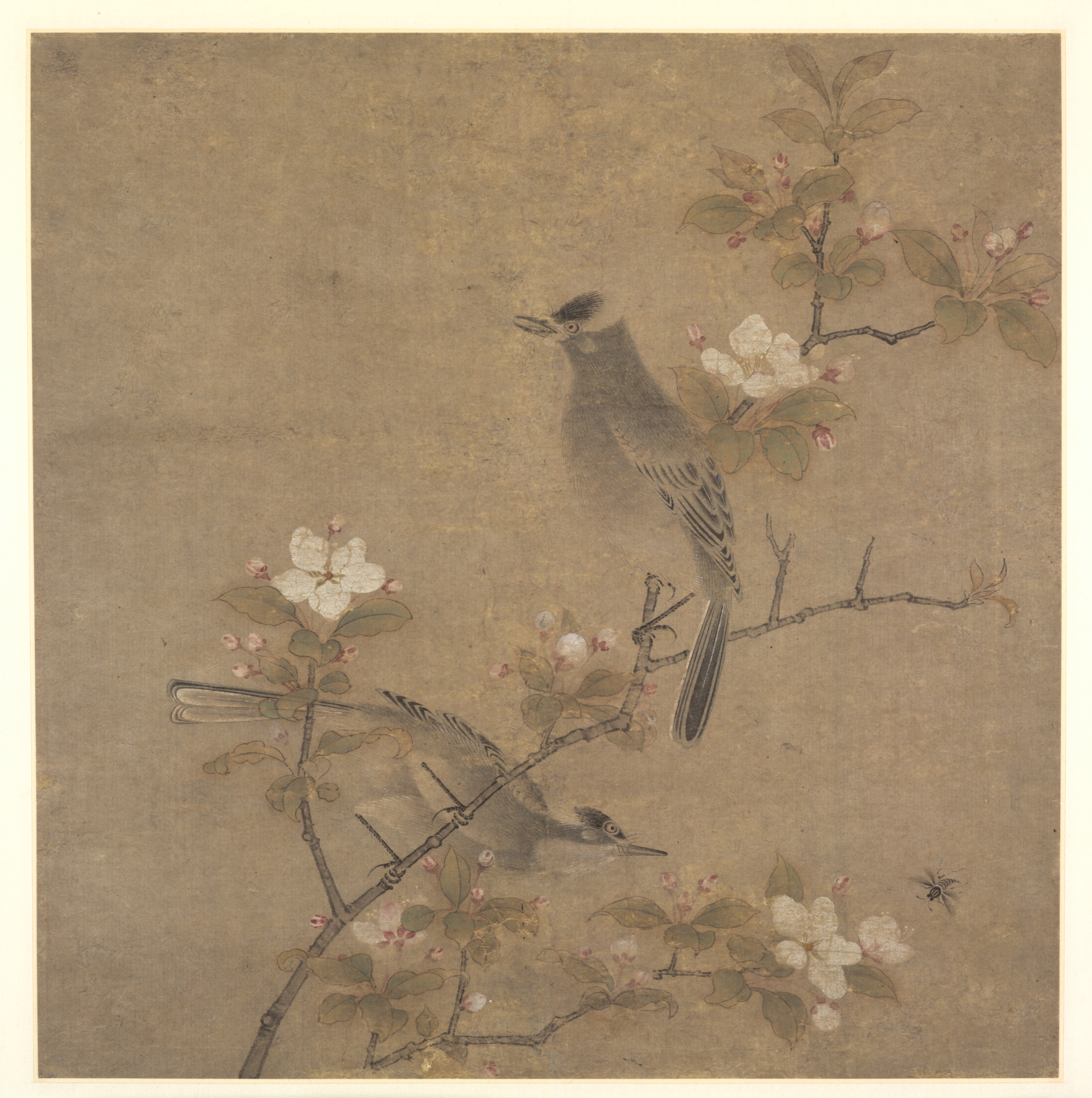 The painting "Flowers and Birds" by Qian Xuan depicts two birds perched on a flowering tree branch against a mottled brown background. The bird on the right faces left, has a black crest on top of its head, a long black tail, and black and white striped wings. The bird on the left, partially hidden, faces right with a long beak. The tree branch extends from the bottom-left corner to the right side with green leaves and white flowers with pink buds. A small insect is visible near the bottom-right corner. The artwork is framed by a thin off-white border.