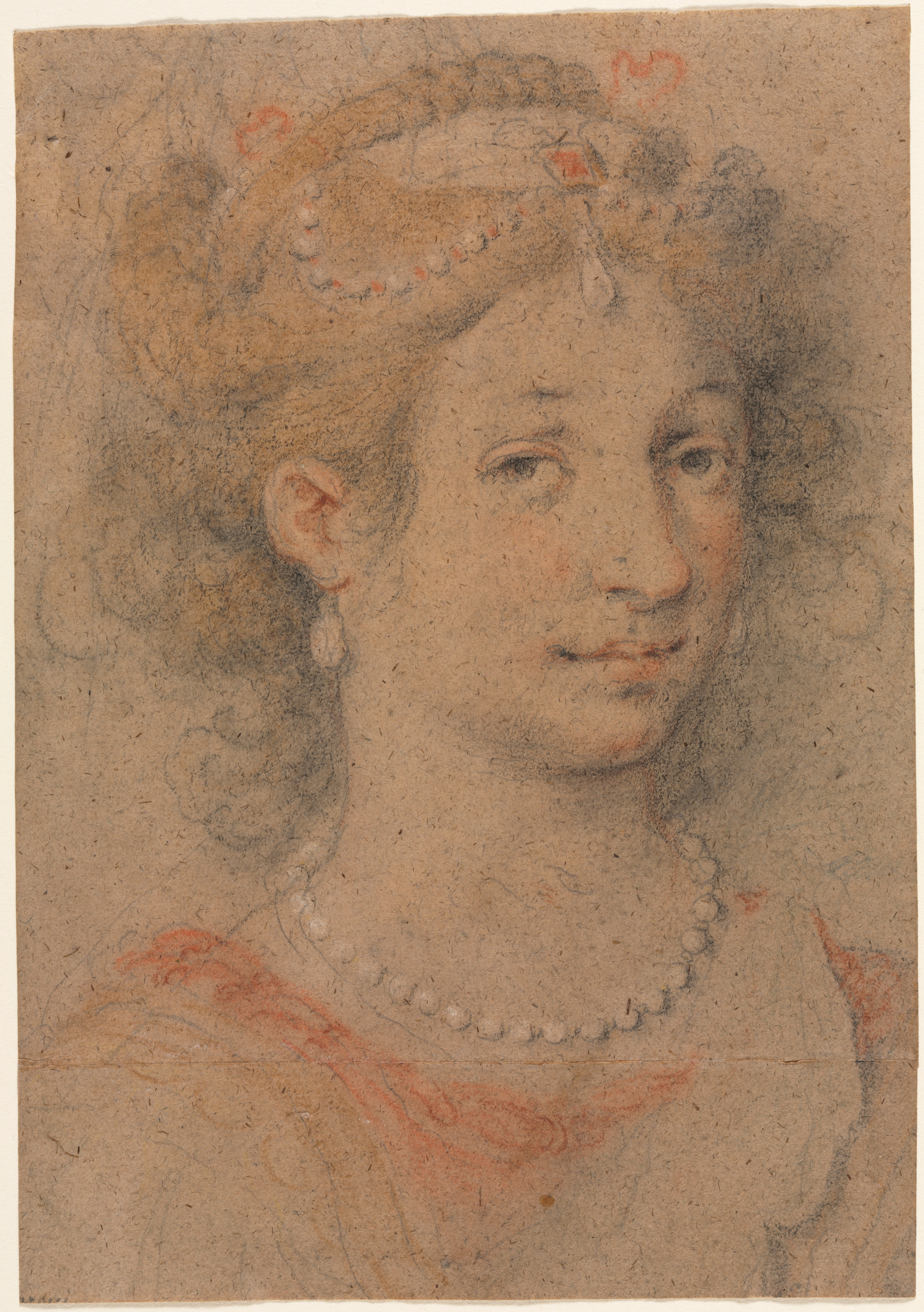 The image shows a portrait drawing of a woman's head and shoulders. The woman has curly hair, adorned with a decorative piece on top of her head. The drawing is in a range of colors including brown, orange, gray, and white. The woman wears a pearl necklace and earrings. The drawing is on brown paper. The background of the drawing is the brown paper. The drawing depicts the woman looking to her right. She has a slight smile on her face. The title of the piece is "Head of a Woman" by Anonymous.