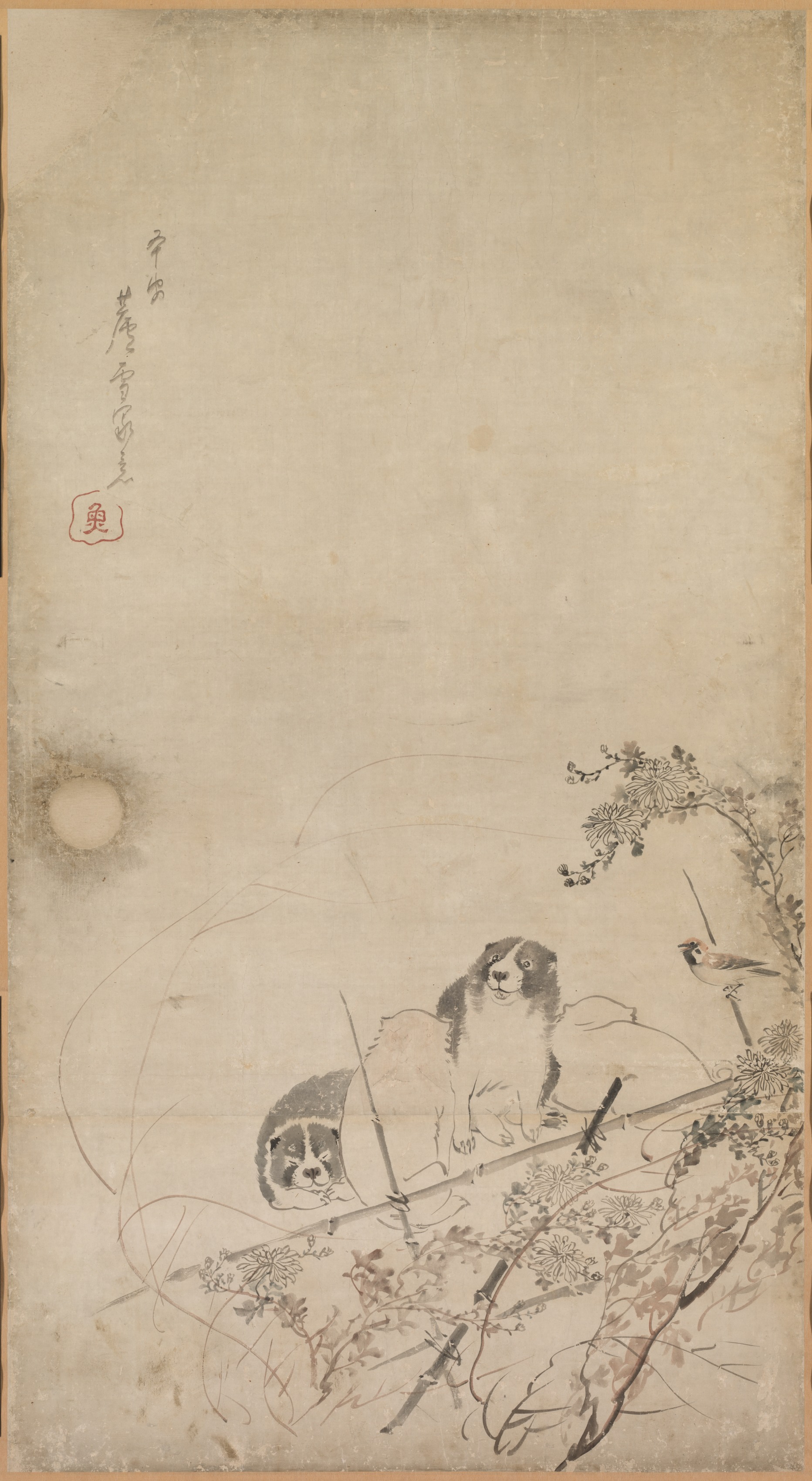 A vertical rectangular piece of aged paper with darker edges and lighter center. In the top left, a column of 9 vertical black characters are written, and below them a red square seal with a character inside. In the bottom right, a diagonal branch with leaves extends from the bottom right corner. On the branch are chrysanthemums. A bird perches on a long thin branch extending to the right. Below the branch, two puppies sit on a ledge; the puppy on the left looks forward and the puppy on the right looks to the right. The puppies have white chests and faces with dark ears. To the left of the puppies and branch is a circular object with shading around it.