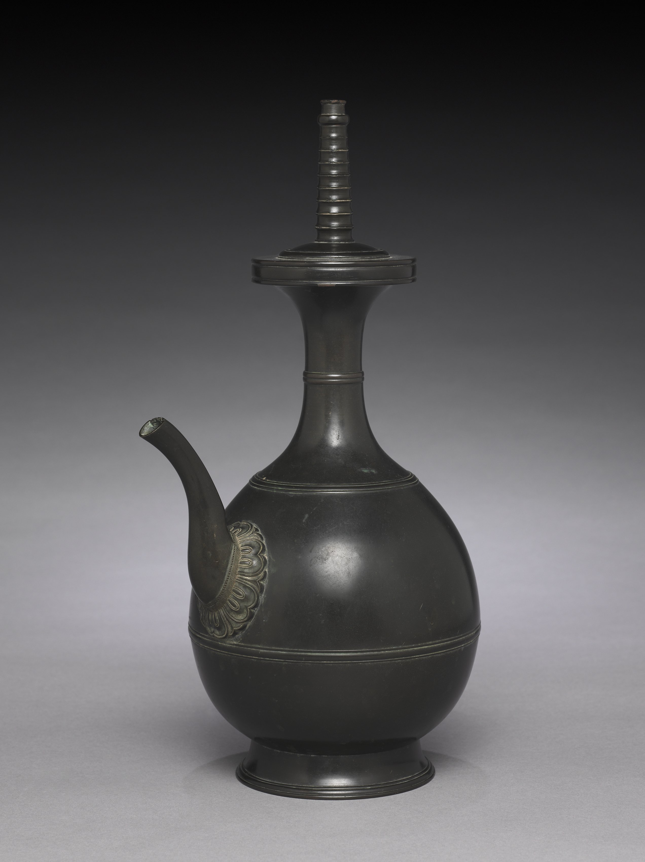 The Ewer, Fusatsugata Suibyō, is a dark-colored, bulbous vessel with a long neck and a spout on the side. The ewer has a round base and a small foot ring. A decorative metal piece is attached to the side of the bulbous section, just above the foot. The long neck features two raised bands around its circumference, and the top of the neck flares out into a circular area. A cylindrical piece with stacked, horizontal rings rises from the center of this circular area. The background of the image is a gradient that transitions from dark at the top to light at the bottom.