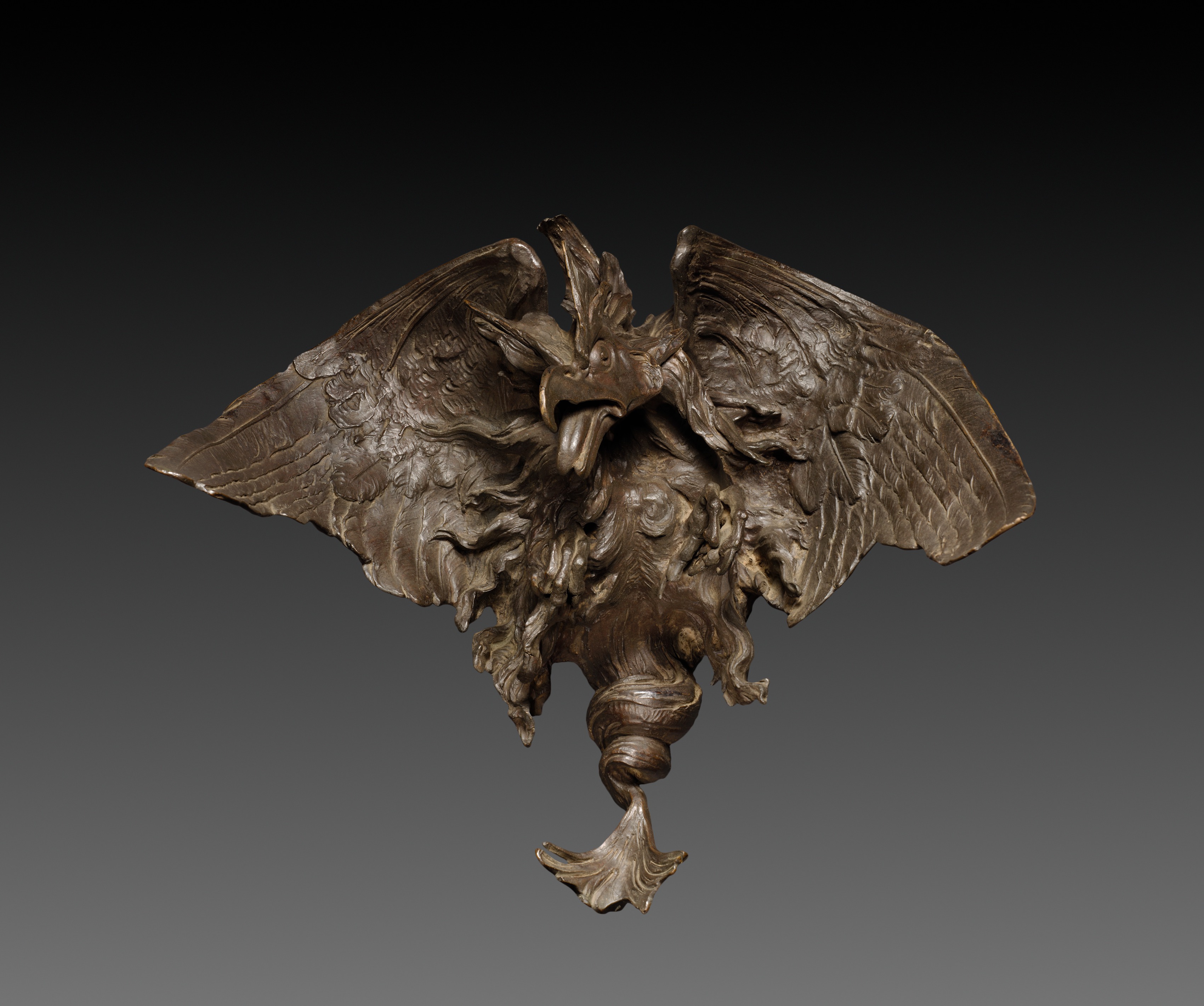 Bronze sculpture titled "Wild Basilisk" by an unknown artist, depicting a creature with a bird-like head, large wings spread out on either side, and a long beak; the body resembling a mass of twisting, curved shapes; the sculpture appears to be attached to a decorative base resembling a leaf or flower; the background transitions from black at the top to dark gray at the bottom.
