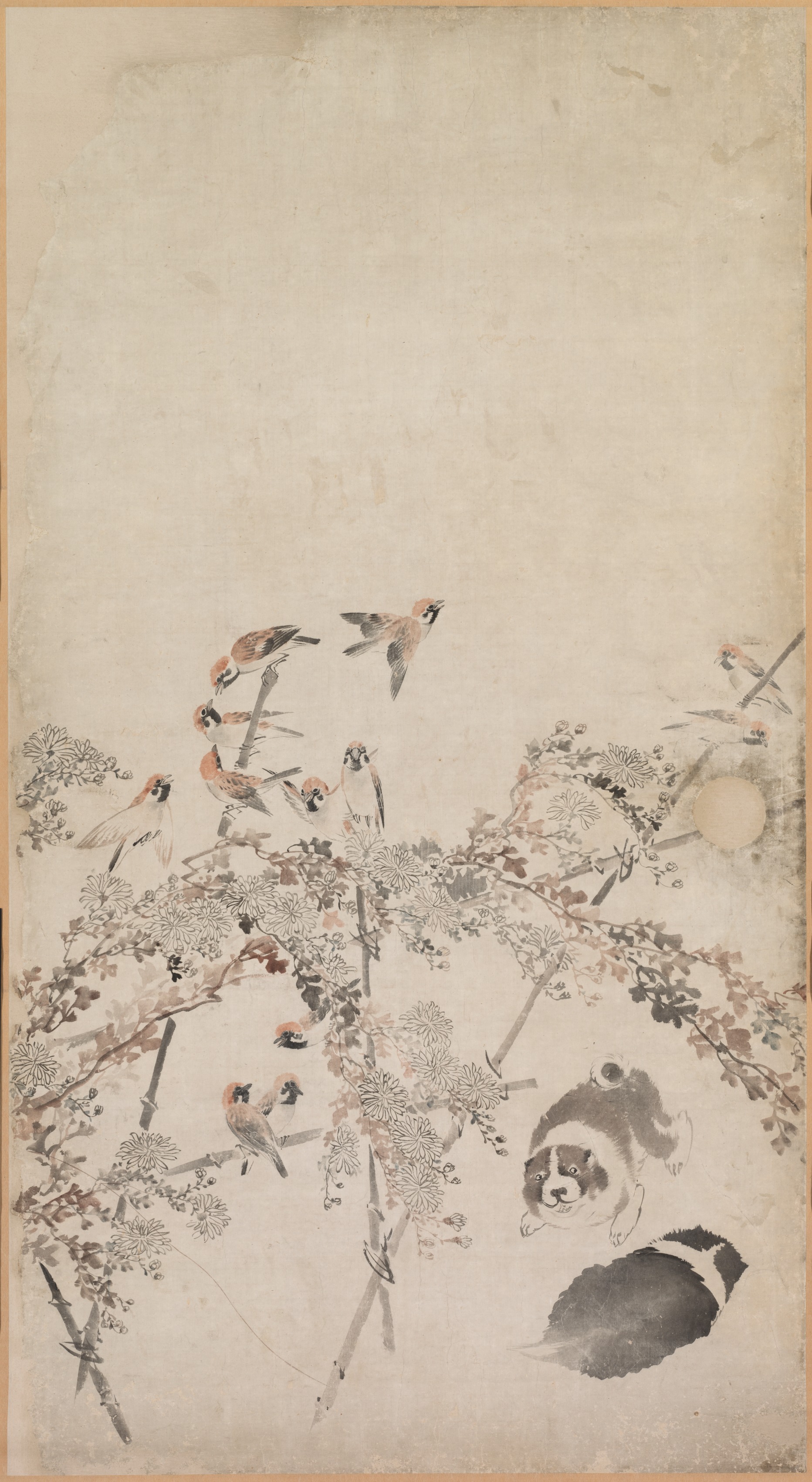 A painting of puppies, sparrows and chrysanthemums. The bottom right features two black and white puppies. One lying on its back with four paws in the air. The other sitting up. The left and center of the painting features a branch of chrysanthemums with green and red leaves. The puppies are surrounded by sparrows with orange and gray heads, black faces, and gray and white bodies. The background of the painting is beige, with no distinct features.
