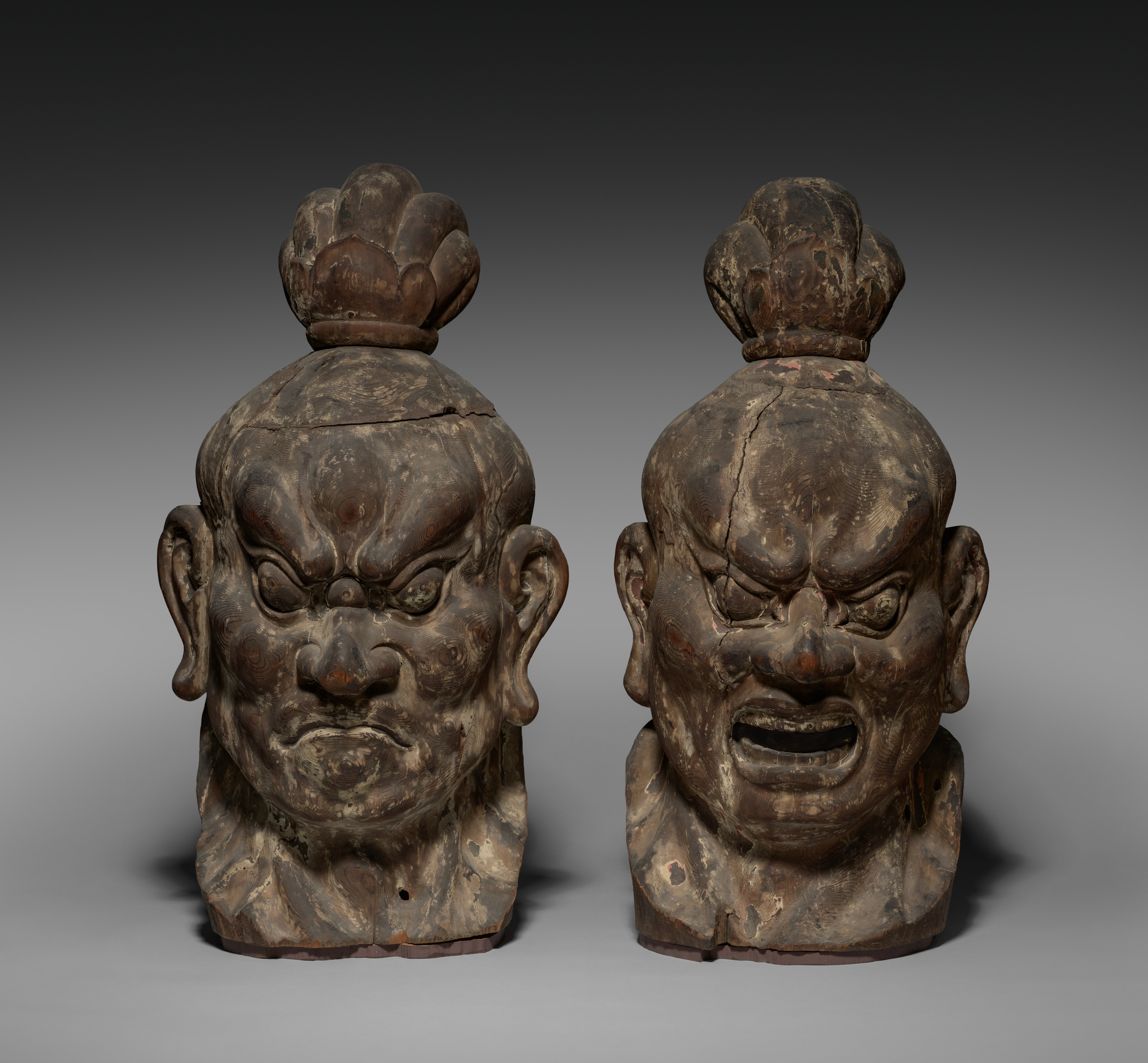 Two brown sculptures of heads with a floral design on top. The sculpture on the left has a closed mouth and the sculpture on the right has an open mouth. The heads are facing forward and have large ears, thick eyebrows, and a stern expression. The background is gray with a darker shade at the top and lighter at the bottom.