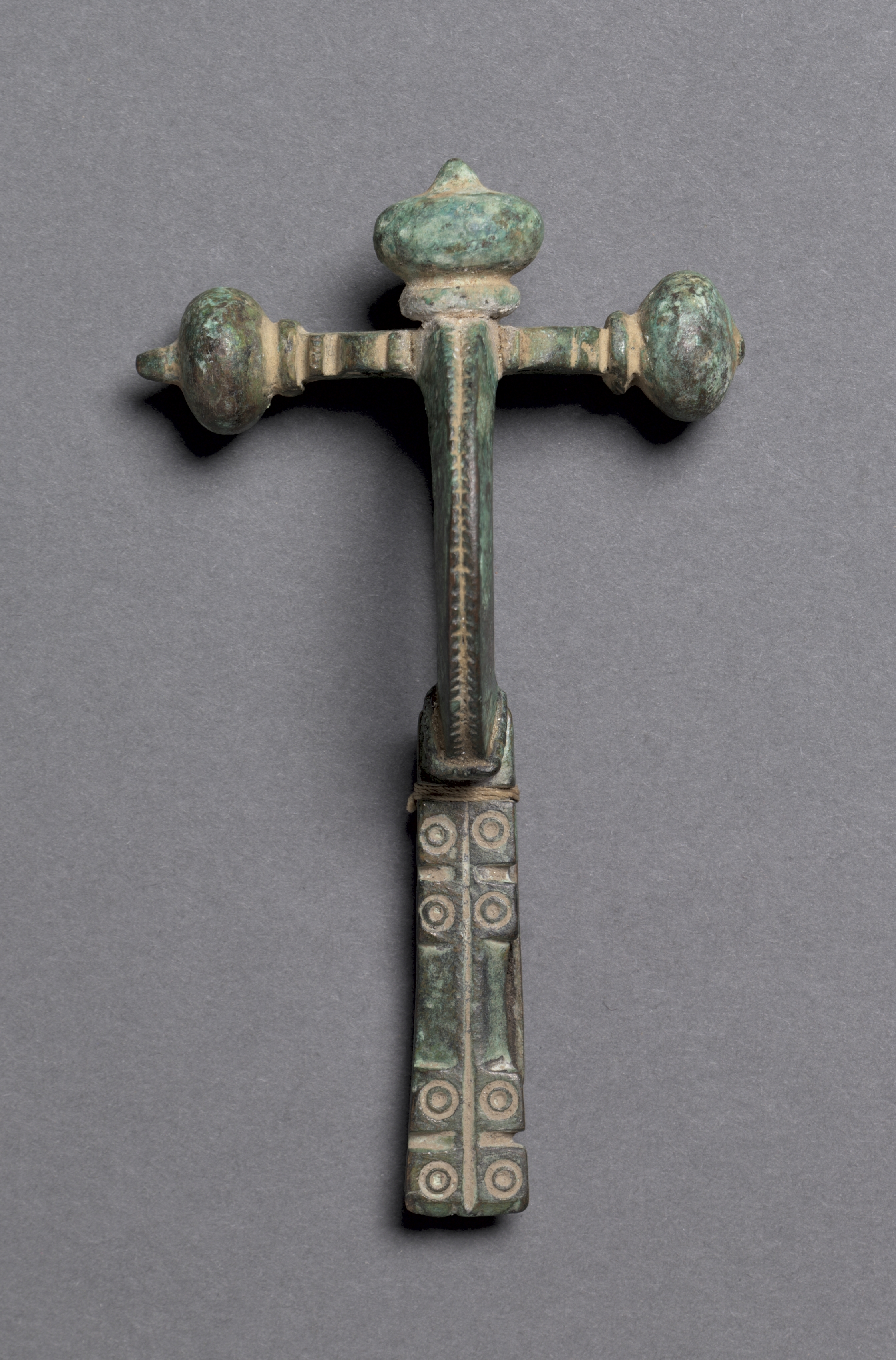 Cross-bow Fibula by artist. Green and beige colored metal object in shape of a crossbow. The object has a long vertical piece with a rounded knob at the top, two shorter horizontal pieces extending from the top of the long piece, each ending in a bulbous shape. The bottom of the long piece is rectangular and wider than the top, featuring decorative circles and lines. The object appears to be made of metal with a weathered patina. The background is a plain gray color.