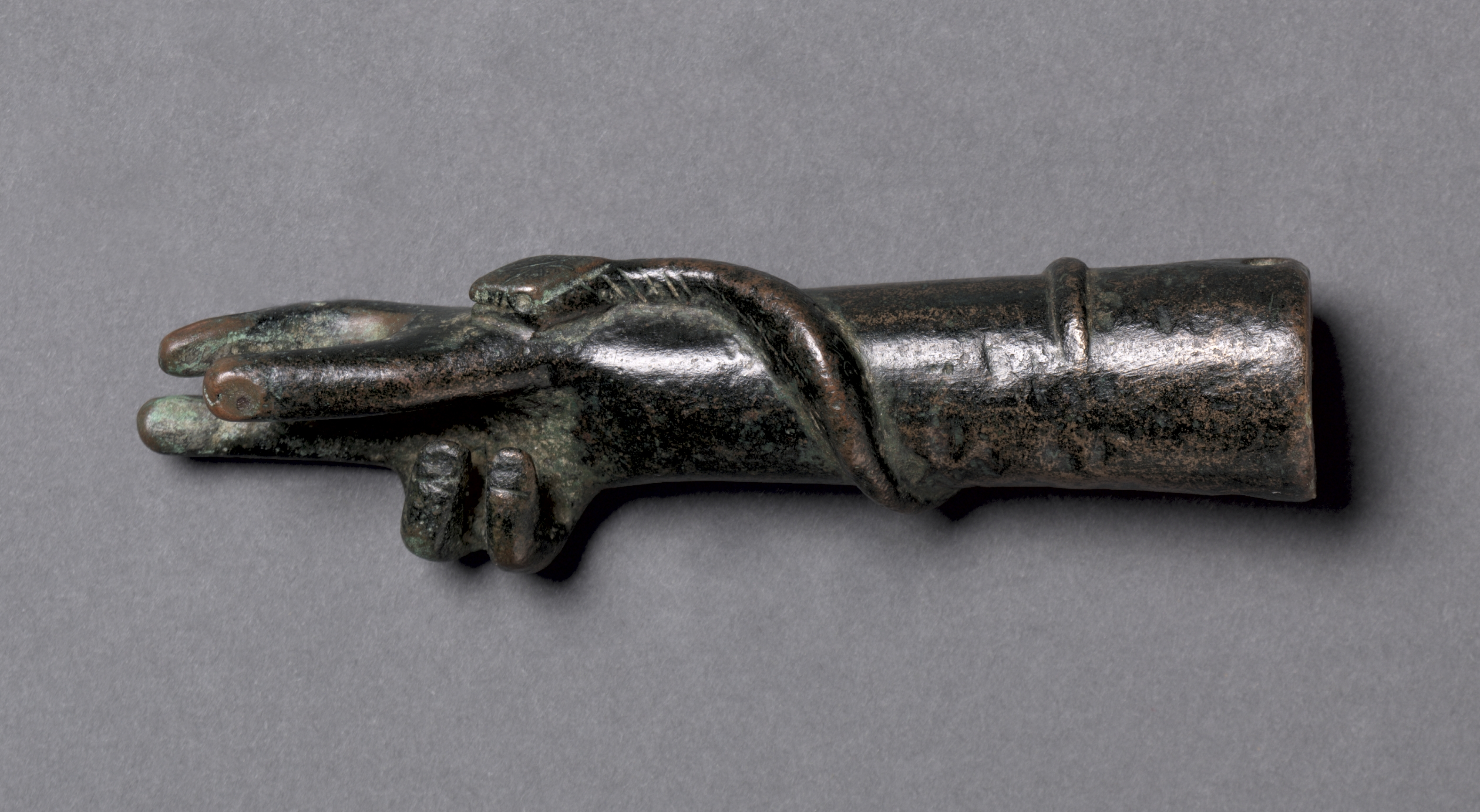 The Votive Arm and Hand of Zeus Sabazios depicts a bronze sculpture of a right arm and hand. The arm is bent at the elbow, with the forearm extending to the left. A cylindrical object, likely representing a votive object or an attribute of the deity, is attached to or integral with the arm. The hand protrudes from the end of the forearm with the palm facing downwards; the index finger and thumb extend while the remaining fingers are curled inwards. The bronze has a dark patina with areas of lighter bronze visible underneath, suggesting wear and tear. Two rounded knobs are on the upper arm. The sculpture sits on a flat, light gray background.