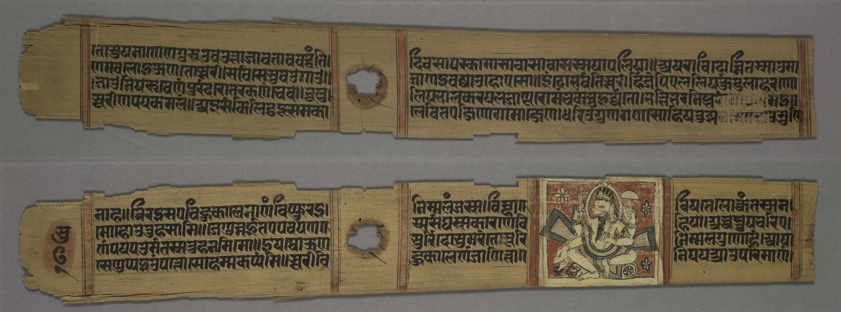 Two long, rectangular pieces of old, light-brown paper with black writing in an ancient language. The top piece has a hole in the middle and faint red lines on either side. The bottom piece has a similar layout but with a colored illustration on the right side. The illustration depicts a figure with a halo, surrounded by a red background with gold accents, holding objects. The figure has a crown and sits on a throne-like structure. The image shows the recto and verso sides of two pages from an ancient manuscript.