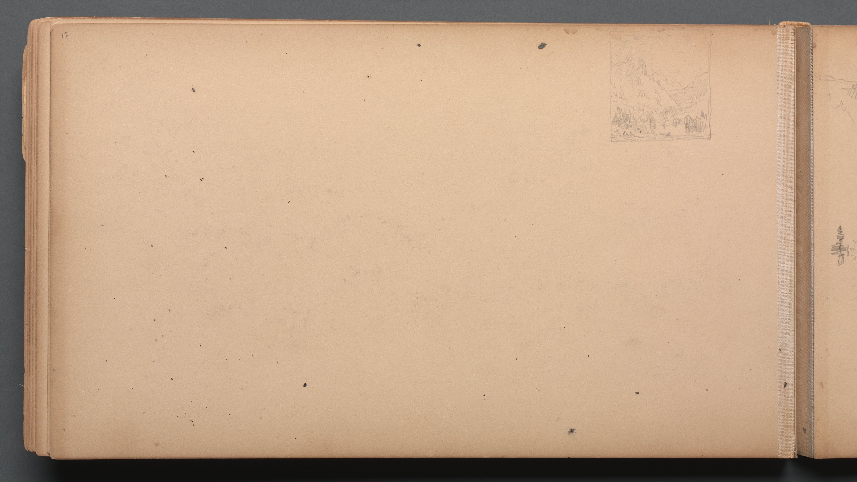 Tan-colored sketchbook page 17, slightly worn and aged with dark spots scattered across the surface. A small pencil sketch in the upper right corner depicts a landscape with a mountain and trees. The page is bound on the right side with a tan fabric strip. The background behind the book is dark gray.