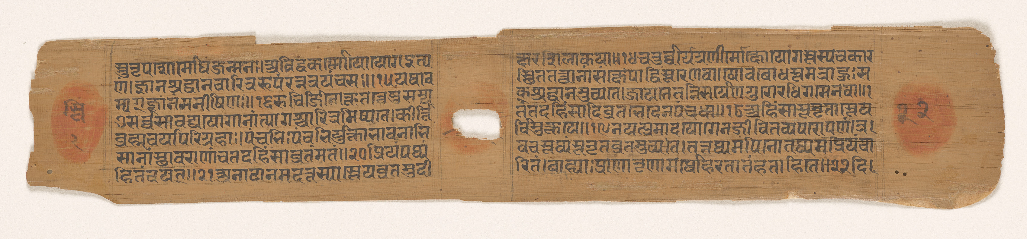 Yellowed rectangular piece of paper with rough edges and a hole in the center, written in black ink with red circular marks at top left and right corners; Sanskrit text in a single column on each side; background gray. Title: Text, folio 22 (verso) from a Yoga-shastra of Hemachandra Artist: Hemachandra