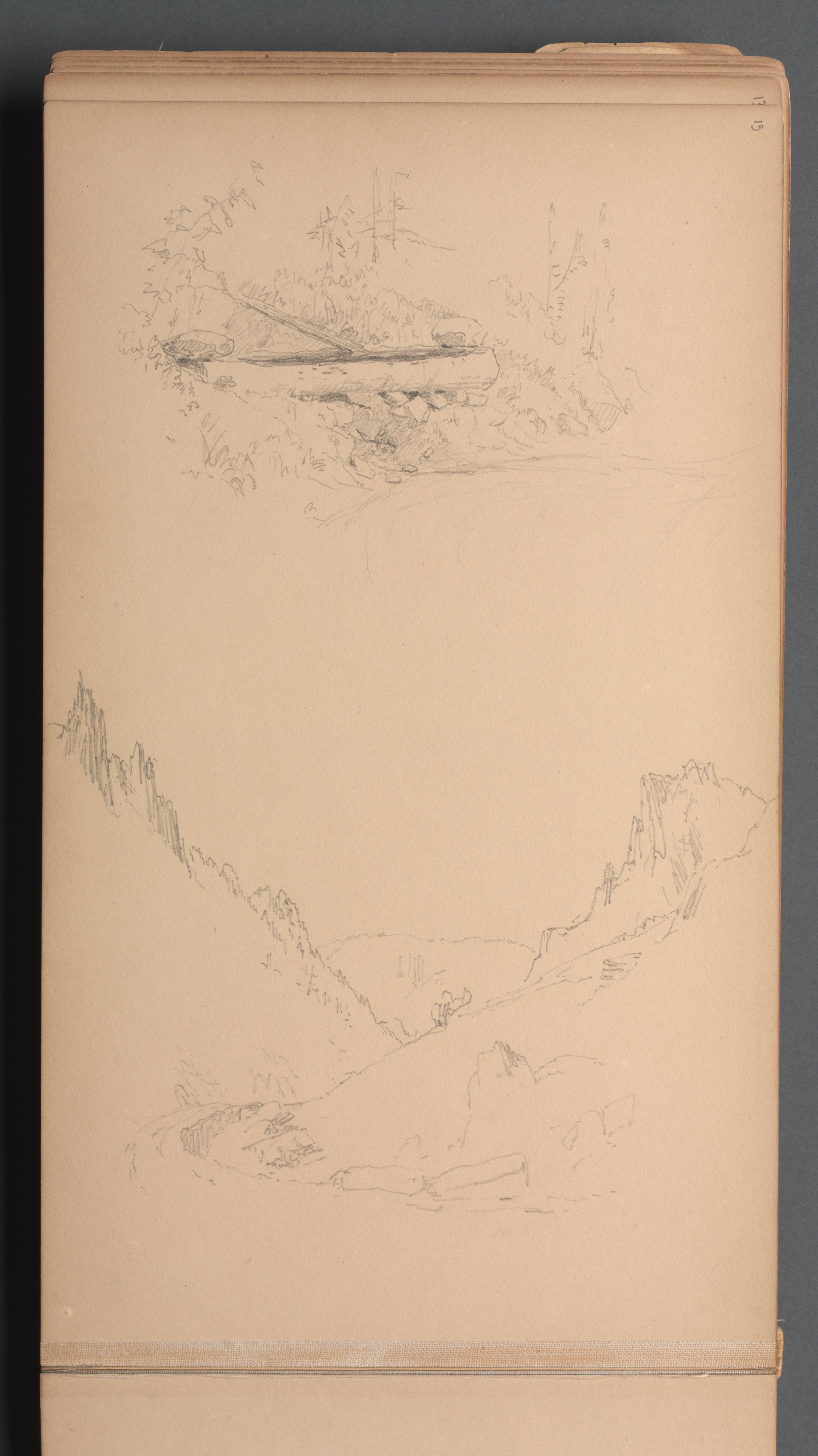 The image shows a sketchbook page with two landscape sketches. The page is light brown and appears to be made of paper. A dark gray background is visible behind the sketchbook. The top sketch depicts a low-lying area with trees and foliage on either side. A horizontal line runs across the middle, suggesting a body of water or a road. The bottom sketch shows a mountainous landscape with jagged peaks and a valley in the foreground. The sketches are drawn in pencil. The sketches appear to be of landscapes with mountains and foliage.