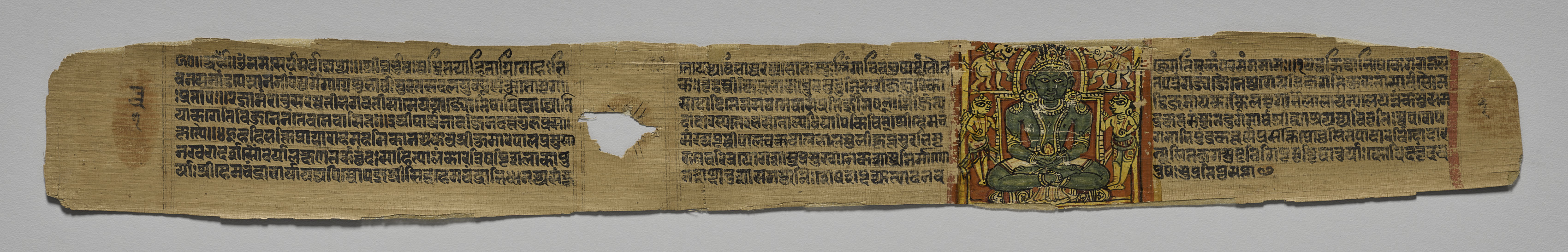A long, narrow piece of aged beige paper. The paper is frayed and torn on all sides with a hole in the middle. Two-thirds of the paper is filled with rows of small black writing in a foreign language. A small section on the right has a colorful illustration of a green figure sitting on a red and gold background. The green figure has a red crown. The figure has four arms and is sitting on a green throne.