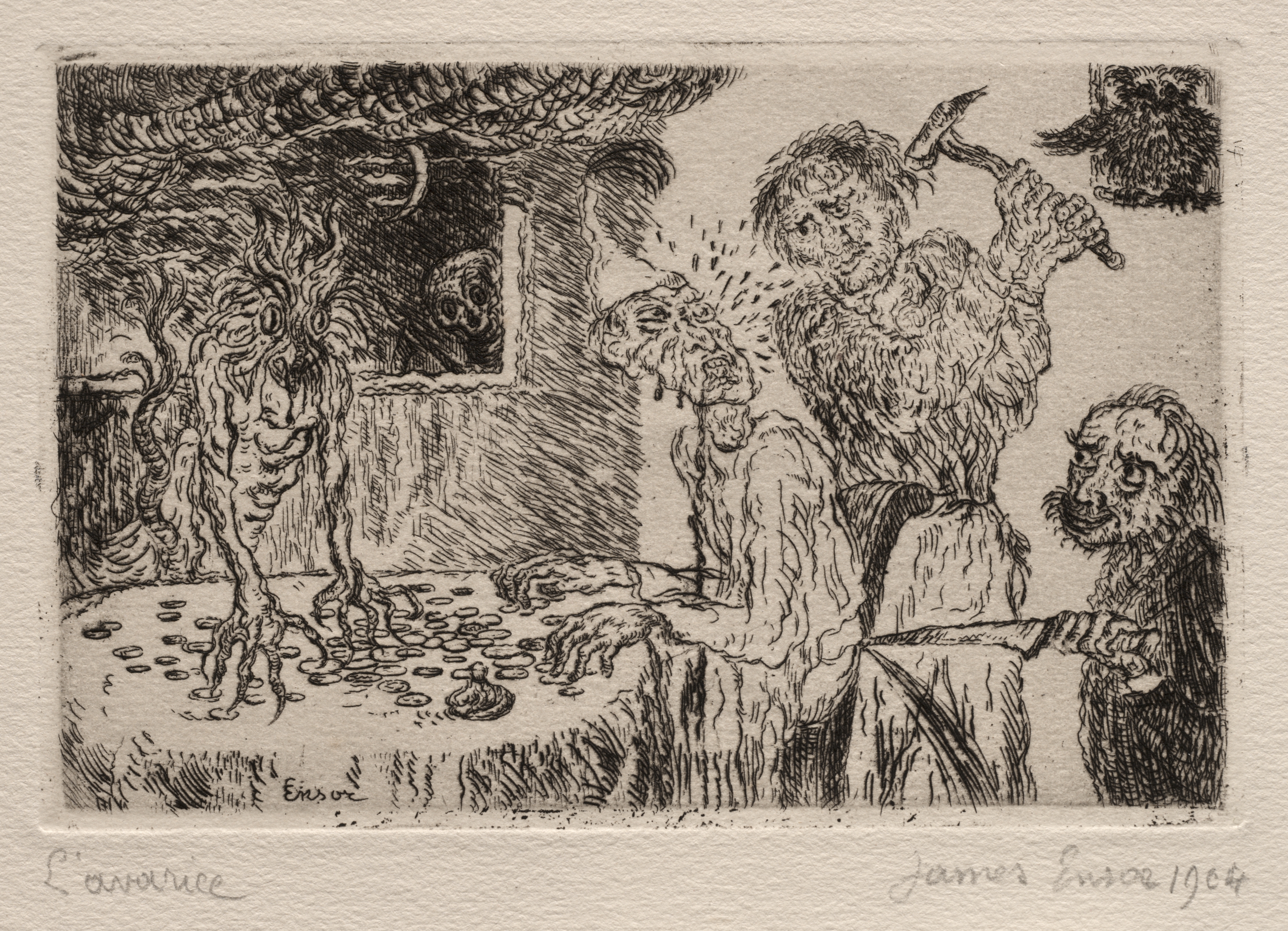 Black and white etching on textured beige paper. A dark scene with four creatures/grotesque human-like figures and tree-like figure. The central figure on the right holds a coin and a stick. Another figure on the right squats, looking to the left. A figure on the left stands by a wall with a niche and an opening to another scene. A pile of coins on a table between the figures. The artwork is signed 'James Ensor 1904' and titled 'L' Avarice'.