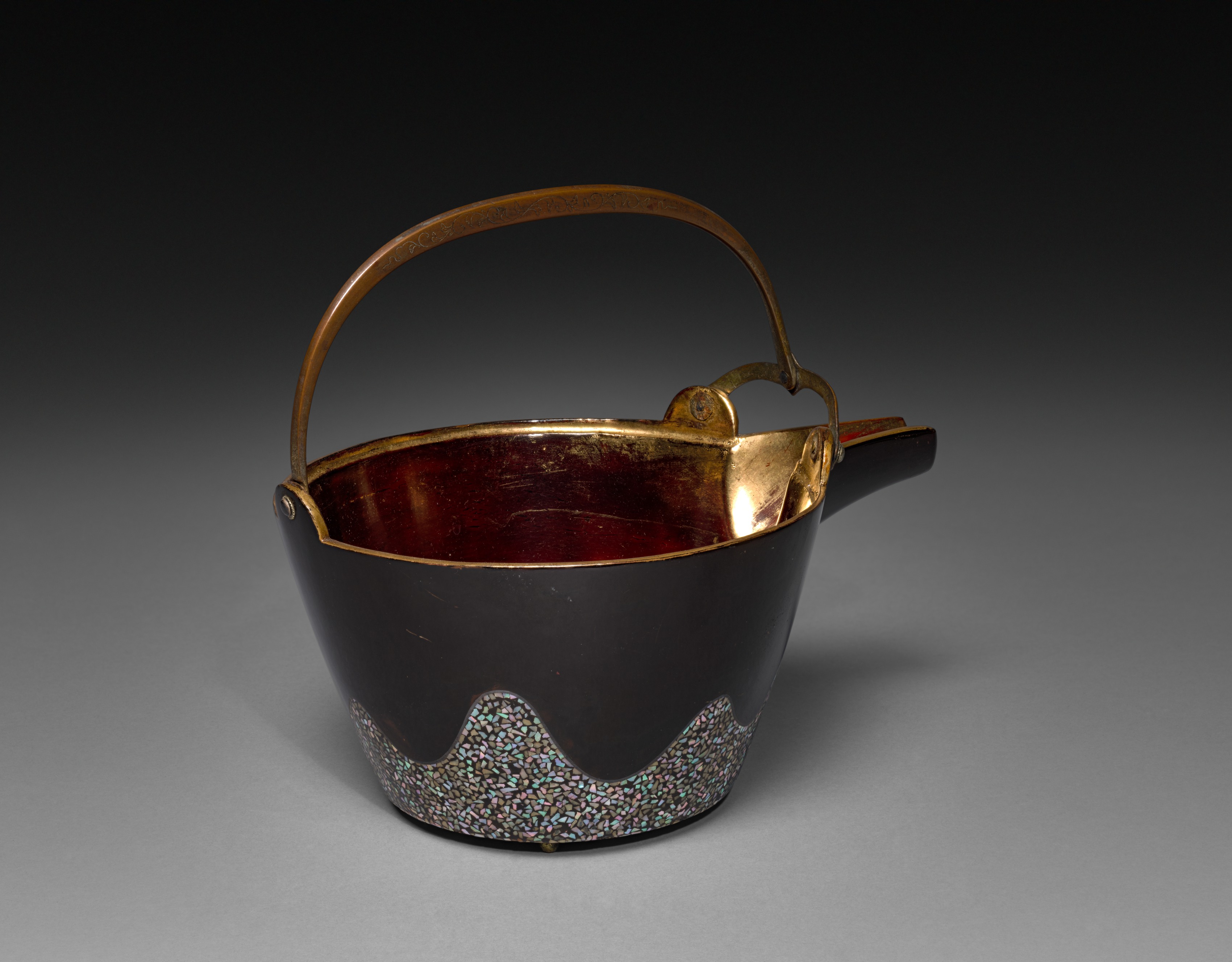 The Wine Ewer, crafted by René Lalique, is a black ceramic vessel with a rounded body and a short, curved spout on the right side. The vessel features a handle made of brass or gold, which is attached to the top and curves over the body. The interior of the vessel appears to be a deep red or brown color. A distinctive feature of the Wine Ewer is the mosaic or inlaid design at the bottom, comprising small, multicolored tiles arranged in a wavy pattern. The background of the image is a gradient that transitions from dark at the top to light gray at the bottom.