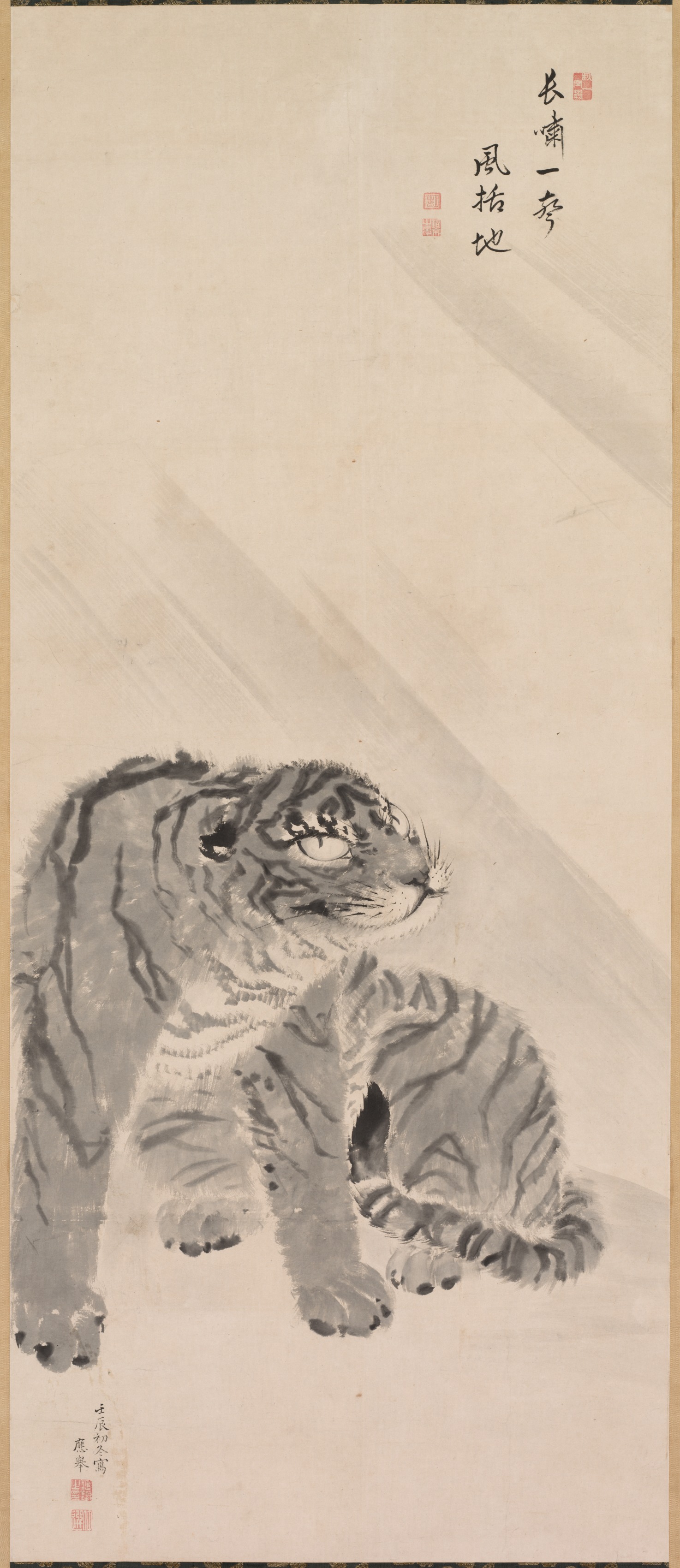 A painting of two tigers on a beige background, the tigers are gray with black stripes, one standing and looking right with eyes cast upwards and the other sitting curled up behind the standing tiger; four red seals and seven characters in black ink are on the top right; and six characters in black ink are on the bottom left.