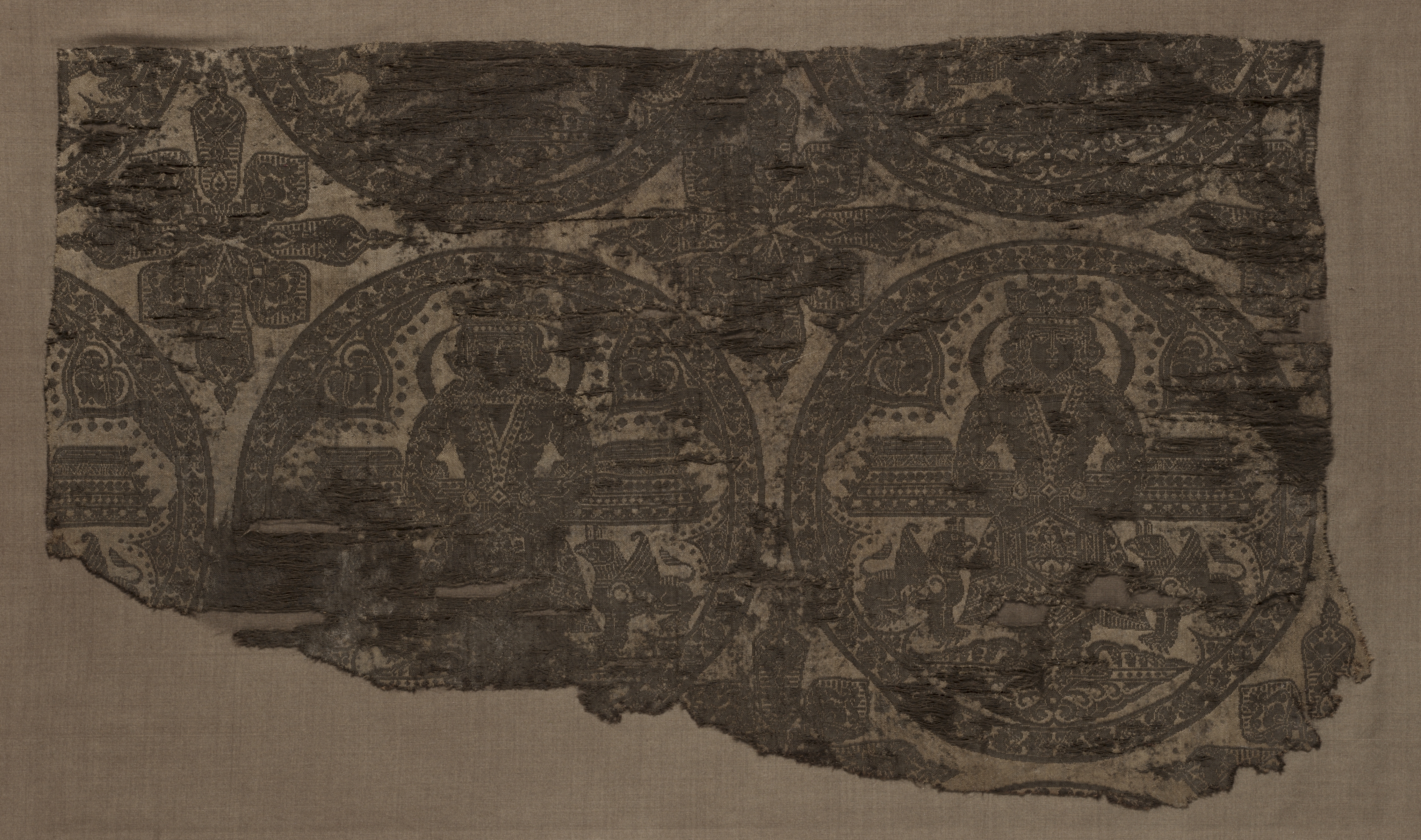 A fragment of a textile with a central design of a seated king flanked by two griffins. The king sits on a throne, wearing a crown. The king and griffins are within a roundel design. The background of the roundel contains geometric and vegetal motifs. There are additional partial roundels and floral designs surrounding the central figures. The fabric is tattered and frayed. The tone is sepia.