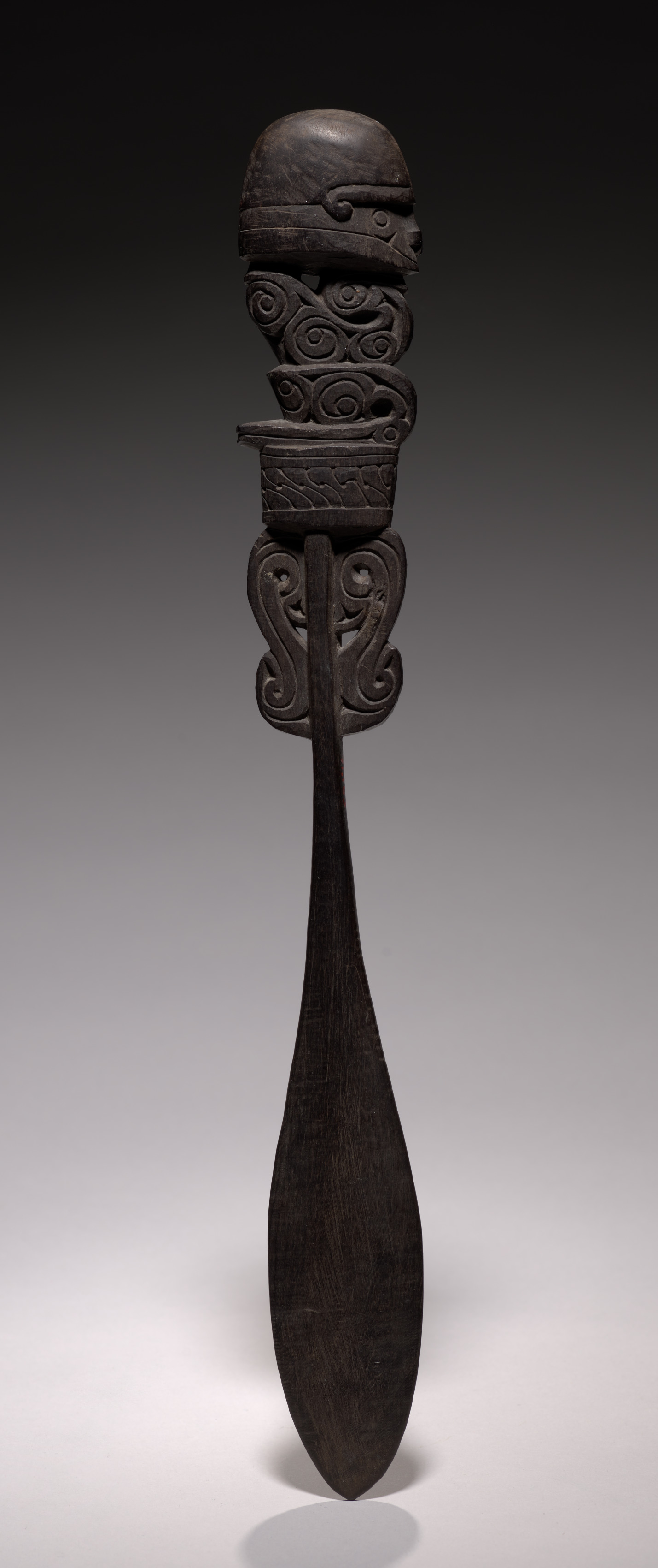 The Lime Spatula by James T. H. Cowan depicts a dark brown or black carved wooden object with a long handle and a decorative top. The object resembles a spoon or spatula with an elongated, teardrop-shaped blade. The handle is slender and tapers towards the bottom. The top features intricate carvings, including a rounded element at the very top, followed by a band with curlicue designs, then a band with a fish scale pattern, and a decorative element with curlicues below it. The background of the image fades from dark at the top to light gray at the bottom.