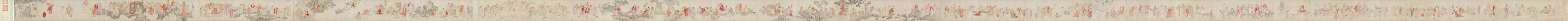The painting depicts 500 figures of arhats. The arhats are drawn in a traditional Chinese style. They are arranged in rows. The figures are standing, sitting, or kneeling. The figures wear robes. The robes are brown. The background is a mottled beige. The painting is done on a long scroll. The scroll is horizontal. The artist is Wu Bin. The title is The Five Hundred Arhats.