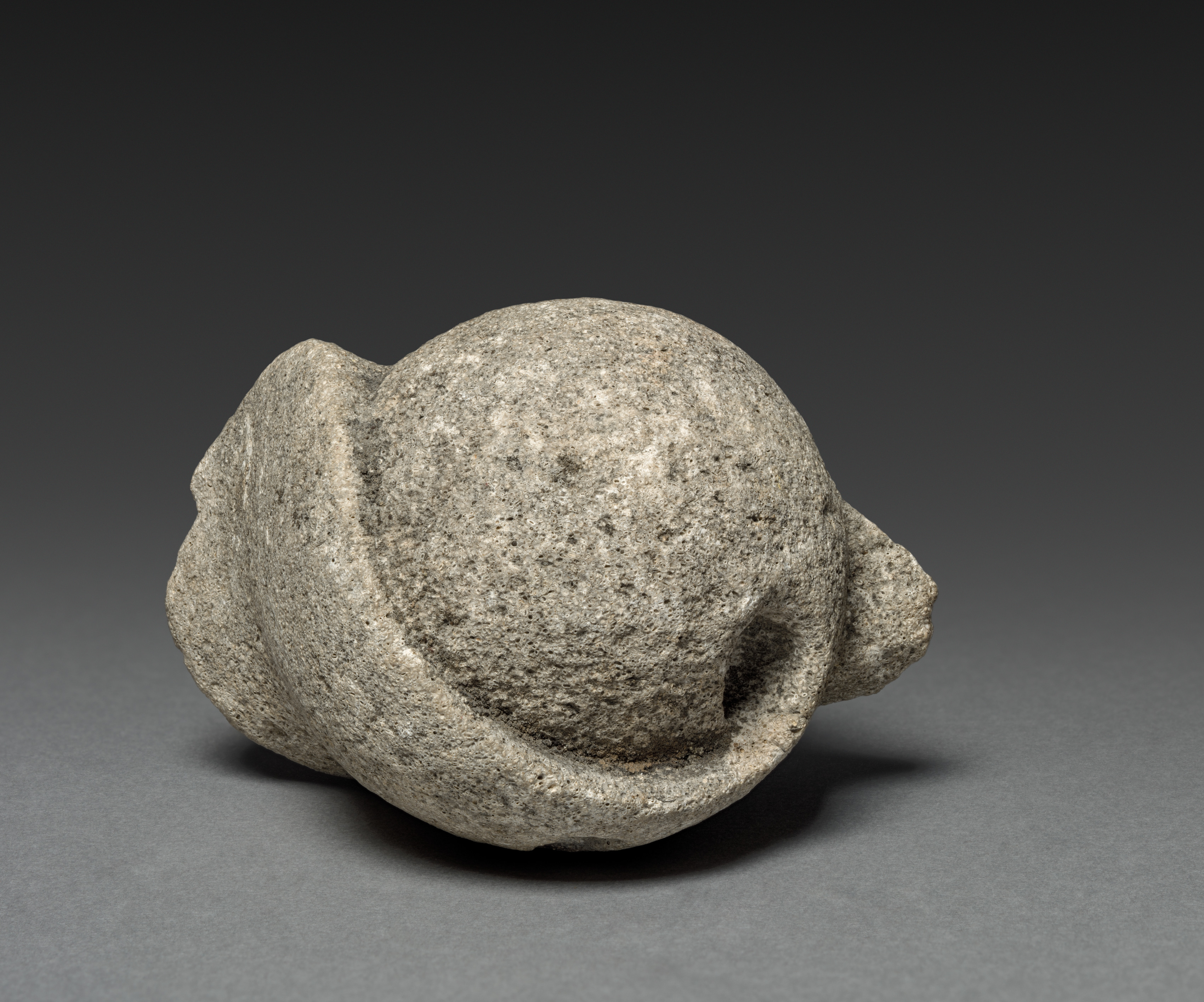 The title is "Spherical Fragment" by artist Isamu Noguchi. Gray stone object, roughly spherical in shape with a protruding curved piece on the bottom. The surface of the object is textured and speckled with darker gray spots. A curved groove encircles the middle. The object has two small protrusions on either side, one on the left and one on the right. The background is dark gray, gradually lightening towards the bottom. The object casts a shadow on the surface below it.