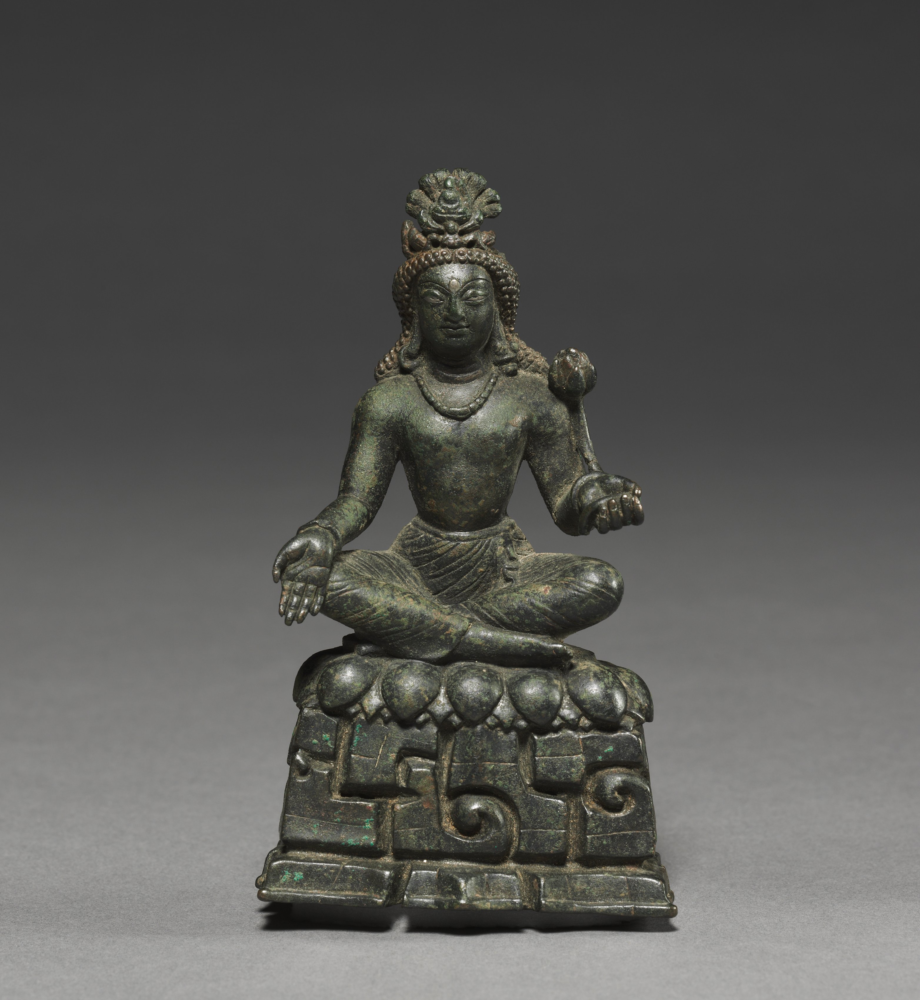 The bronze statue depicts Padmapani Lokeshvara seated on a rock. The figure sits cross-legged on a square base adorned with a row of rounded shapes along the top edge and a scroll design on the front. The figure wears a necklace and a crown-like structure on their head. They have long hair and wear a cloth wrapped around their waist. Their right hand is palm up, while their left hand holds an object. The figure's eyes are closed, and their facial expression is serene. The background of the image is dark gray, gradating to light gray towards the bottom, and the statue appears to have a greenish patina.