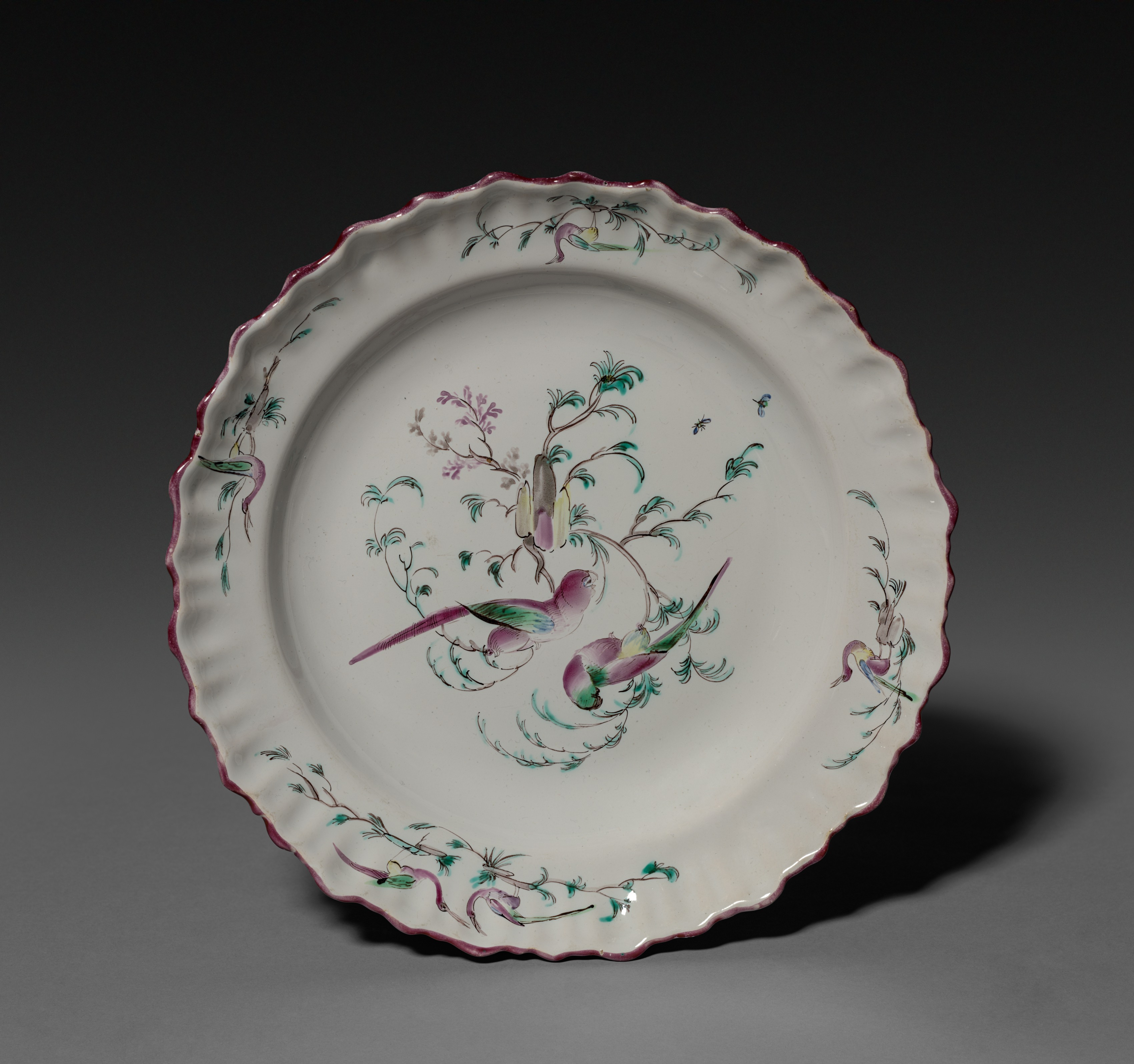 White plate with scalloped edge and pink trim. The plate features a design of birds, leaves, and flowers in shades of pink, green, and purple. Two birds are prominently displayed in the center, surrounded by branches with leaves and flowers. Additional birds and foliage are painted around the rim. The background of the plate is white, and it appears to be set against a dark background with a shadow cast to the right. The plate is by Ferrat Factory.