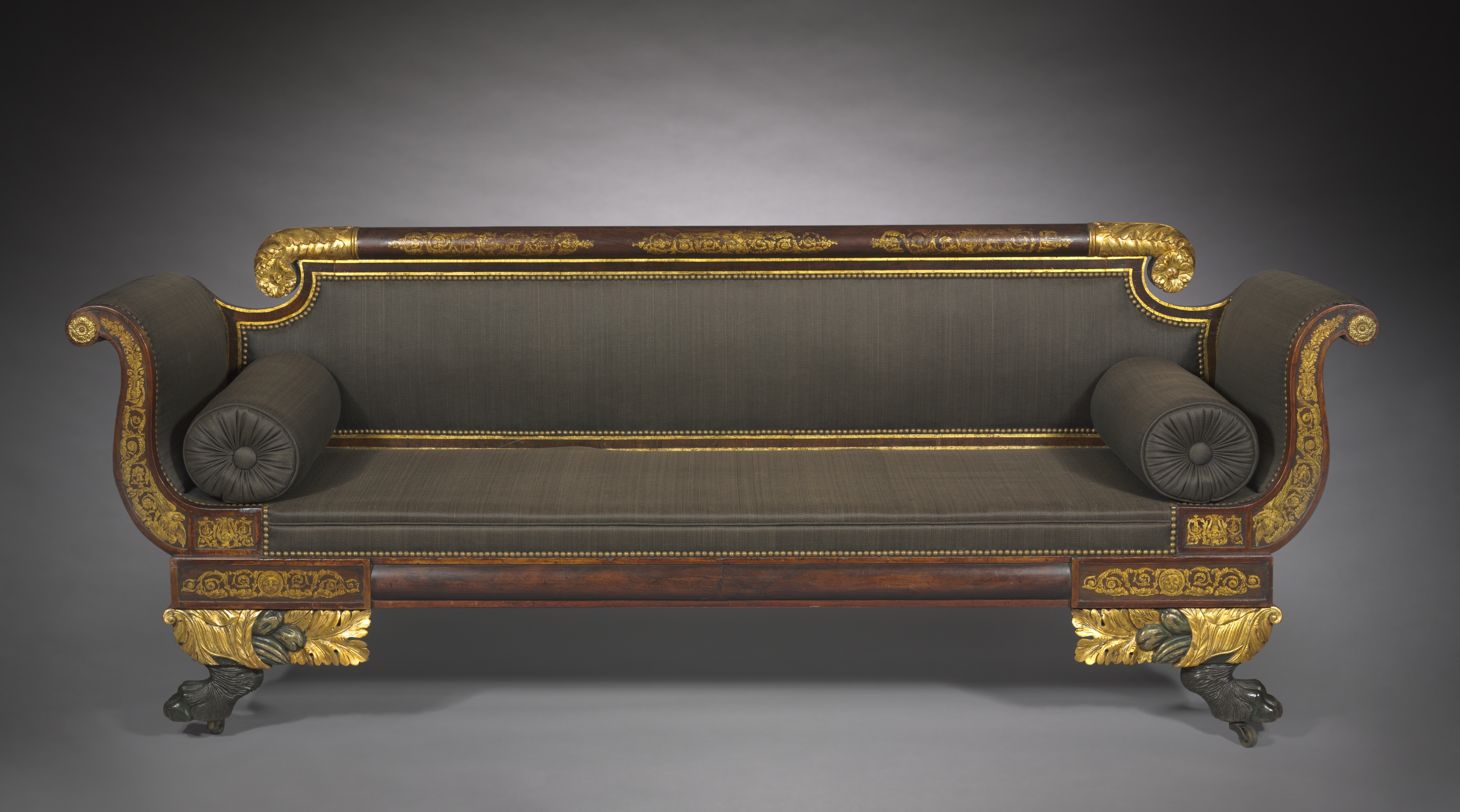 The image depicts a sofa by artist "Sofa". The sofa has a brown wooden frame with gold accents. The frame features ornate gold designs on the arms, legs, and top. The arms are curved and have a rolled bolster pillow on each side. The sofa's upholstery is dark green with a ribbed texture. There are two horizontal gold lines on the seat and backrest. The legs of the sofa are black and have a claw-like design. The background of the image is a gradient from dark gray to light gray.