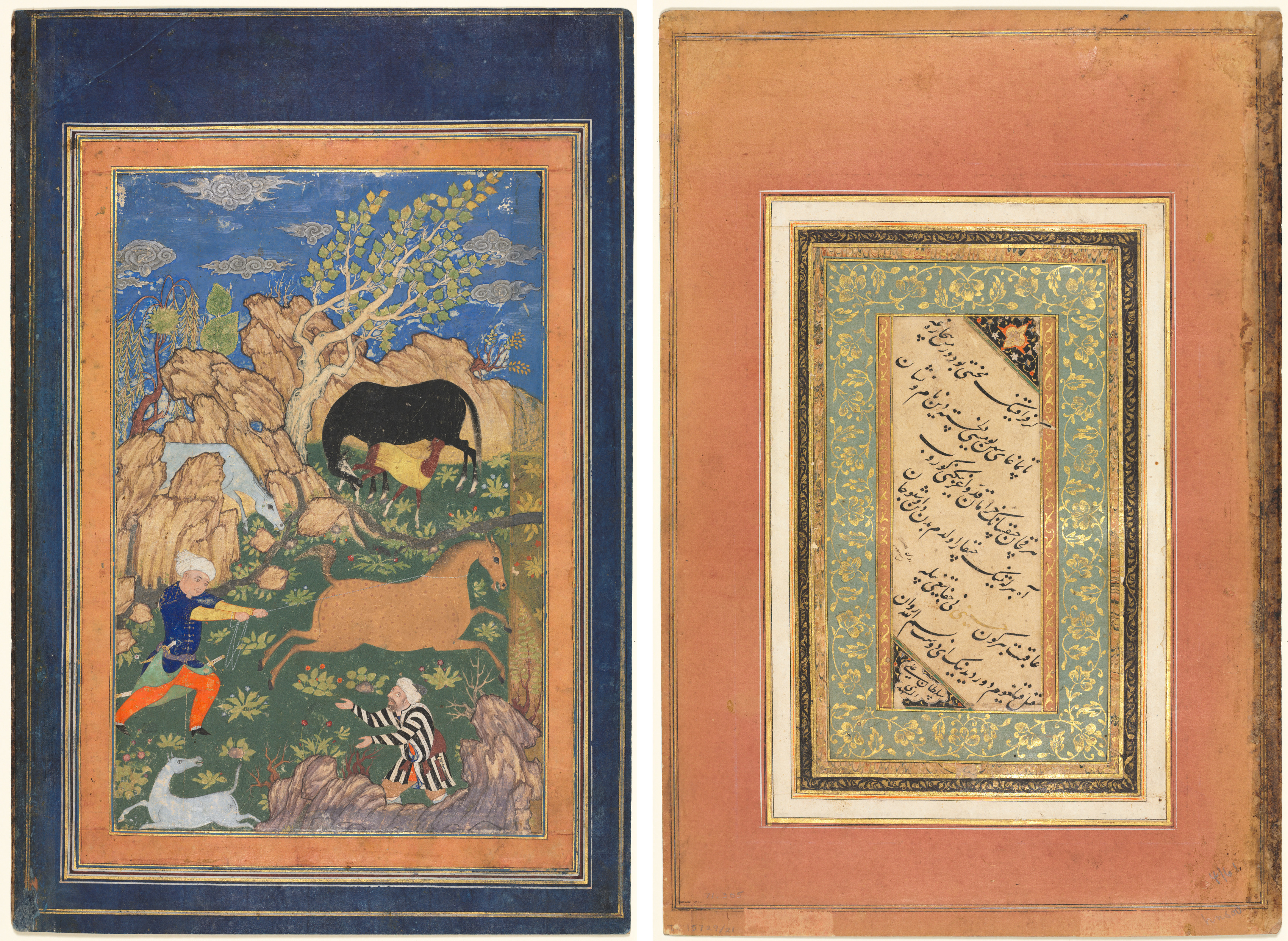 Hunting with falcons in a landscape; verso: Calligraphy of Chaghatai Turkish poems in praise of wine, Sultan Muhammad Nur (Persian, c. 1472–1536) and Mirza Muhammad (probably Persian, active c. 1520s)