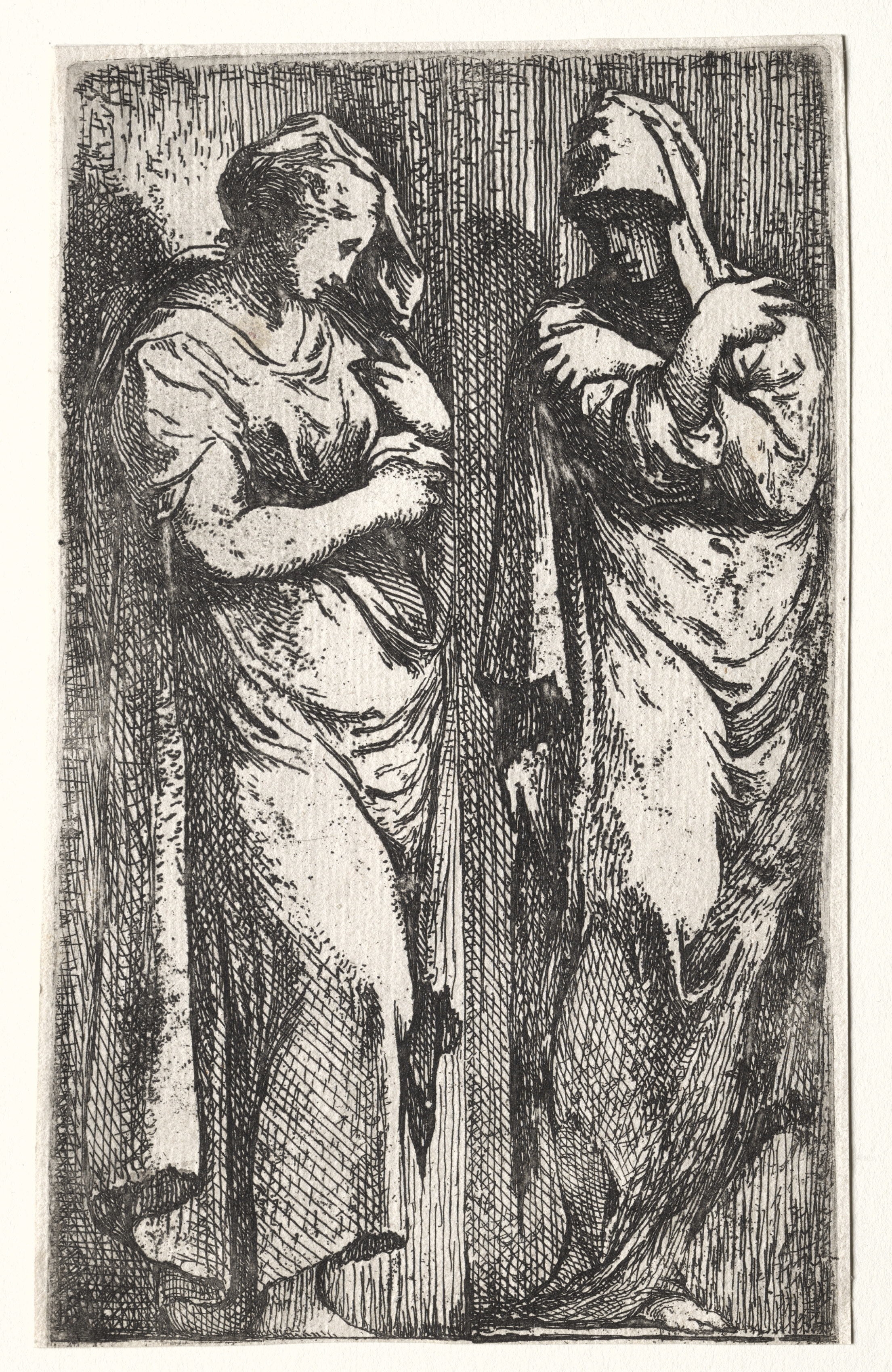 Black and white drawing of two female figures. The figure on the left stands with their left leg crossed over the right. The figure on the right stands with their right leg crossed over the left. Both figures wear a head covering and a long robe. The figure on the left touches their forehead with their right hand and their neck with their left hand. The figure on the right touches their forehead with their right hand and their shoulder with their left hand. The background consists of vertical lines. The drawing is framed by a thin border. The drawing style is highly detailed and uses many short lines. The title of the drawing is "Two Roman Women" and the artist is Francesco Primaticcio.