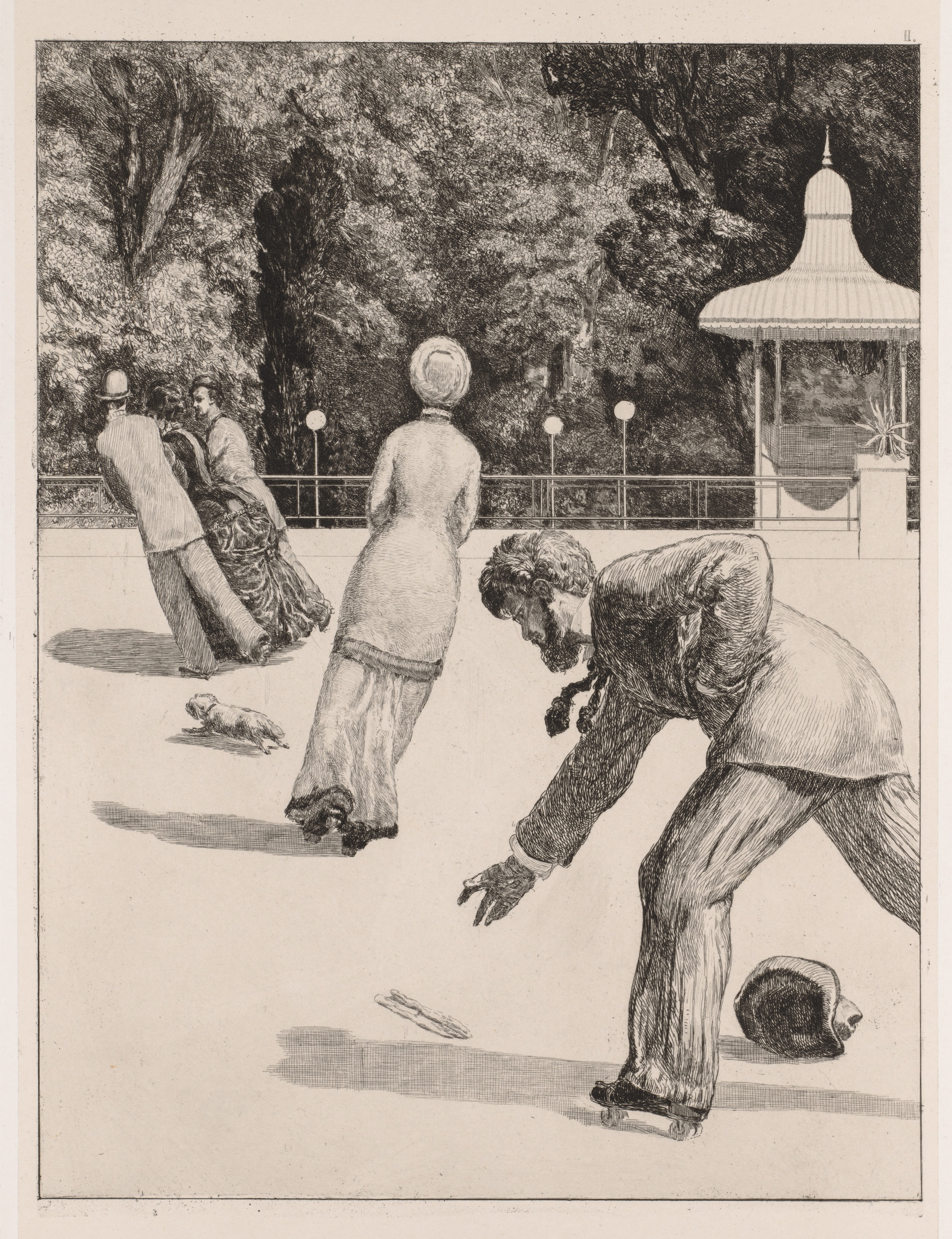 Black and white drawing of people playing bowling. The man in the foreground is leaning over and about to roll a ball down the lane; he wears a suit and has short hair. A bowling ball and a bowling pin are on the ground near him. A woman in a long dress and hat and another man and woman are in the background; the man wearing a hat. A small dog is on the ground. There are trees, a fence with posts and a gazebo in the background.