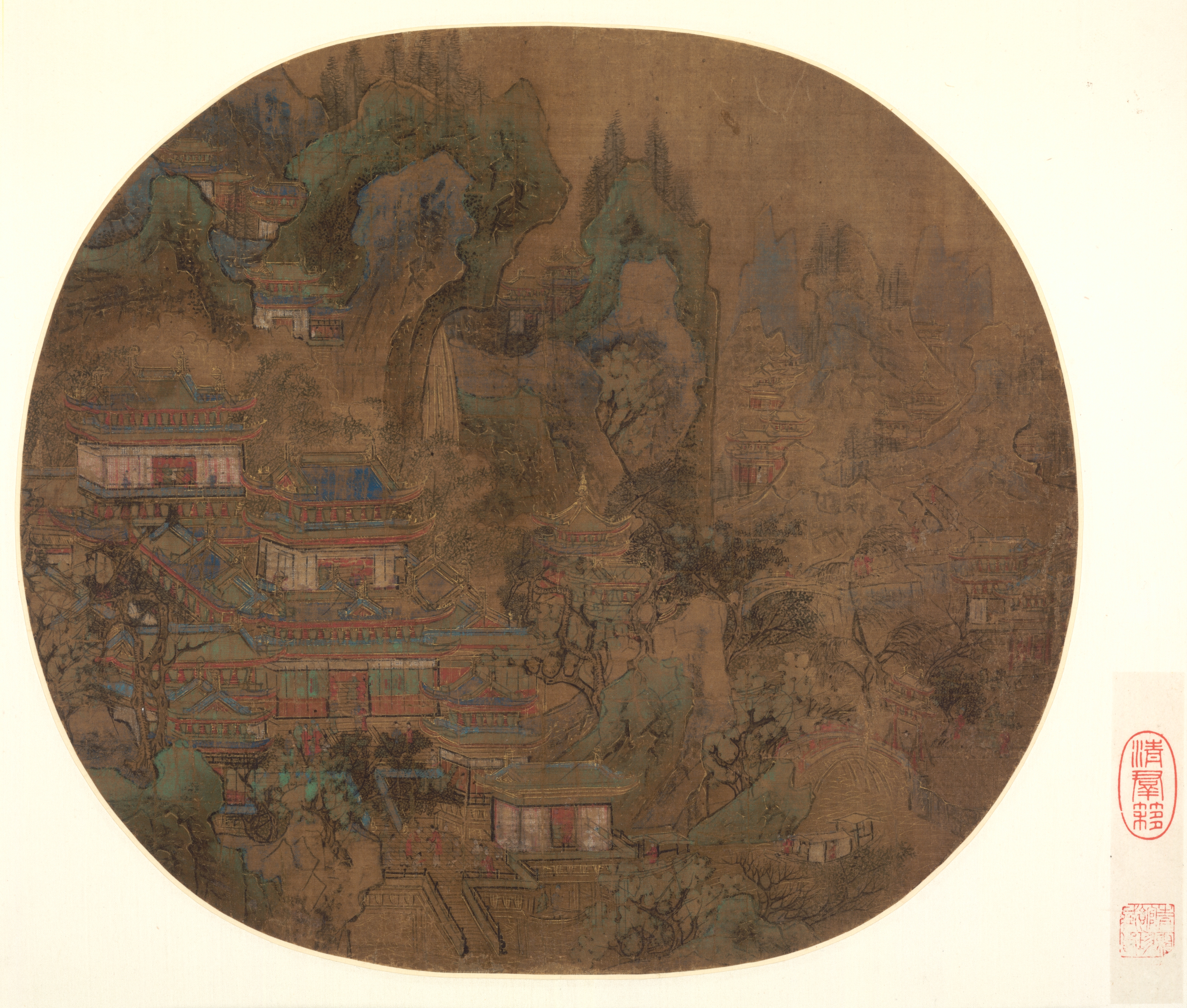 The image titled "Palace Landscape" by an unknown artist features a large oval painting. The painting depicts a landscape with buildings and trees. The oval painting has a brown background with green, blue, red and white accents. The buildings are multi-tiered with colorful roofs. The buildings are positioned on a hillside with trees scattered throughout. The hillside rises to the top of the oval with additional buildings and trees. The right side of the oval is less detailed than the left. There are red stamps on the bottom right of the image outside of the oval. The background behind the oval is white.