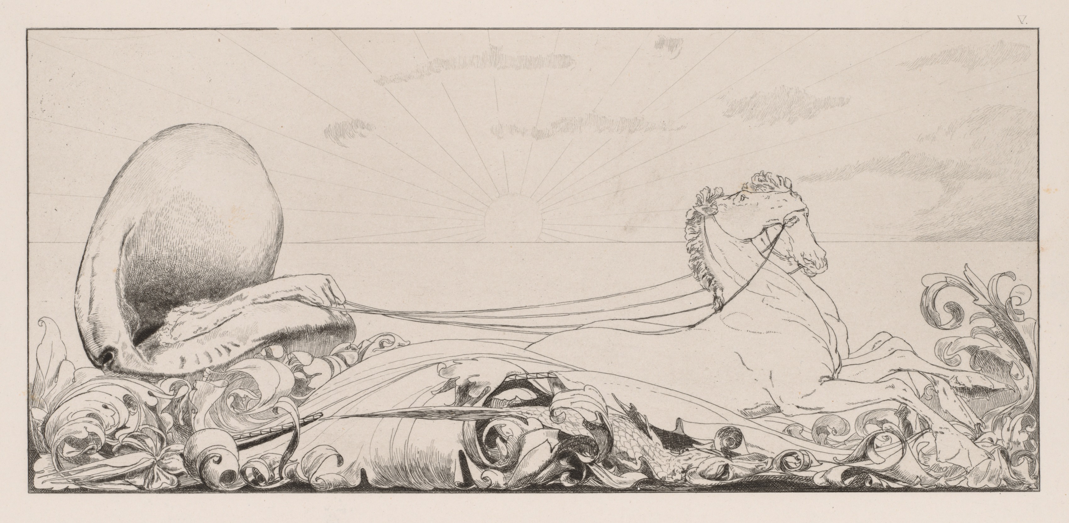 Black and white drawing of a reclining woman, seen from the waist up, wearing a large hat and floral headpiece. The woman's body faces right, with her head turned left toward the viewer. She wears a large rounded hat; her hair is styled into a headpiece with floral elements on the right side. Her left arm extends toward a rearing horse on the right. The woman and horse are surrounded by curving decorative floral motifs and tendrils at the bottom of the image. In the background, rays of light emanate from a central point, with clouds in the upper right. A thin black border frames this image on a beige background.