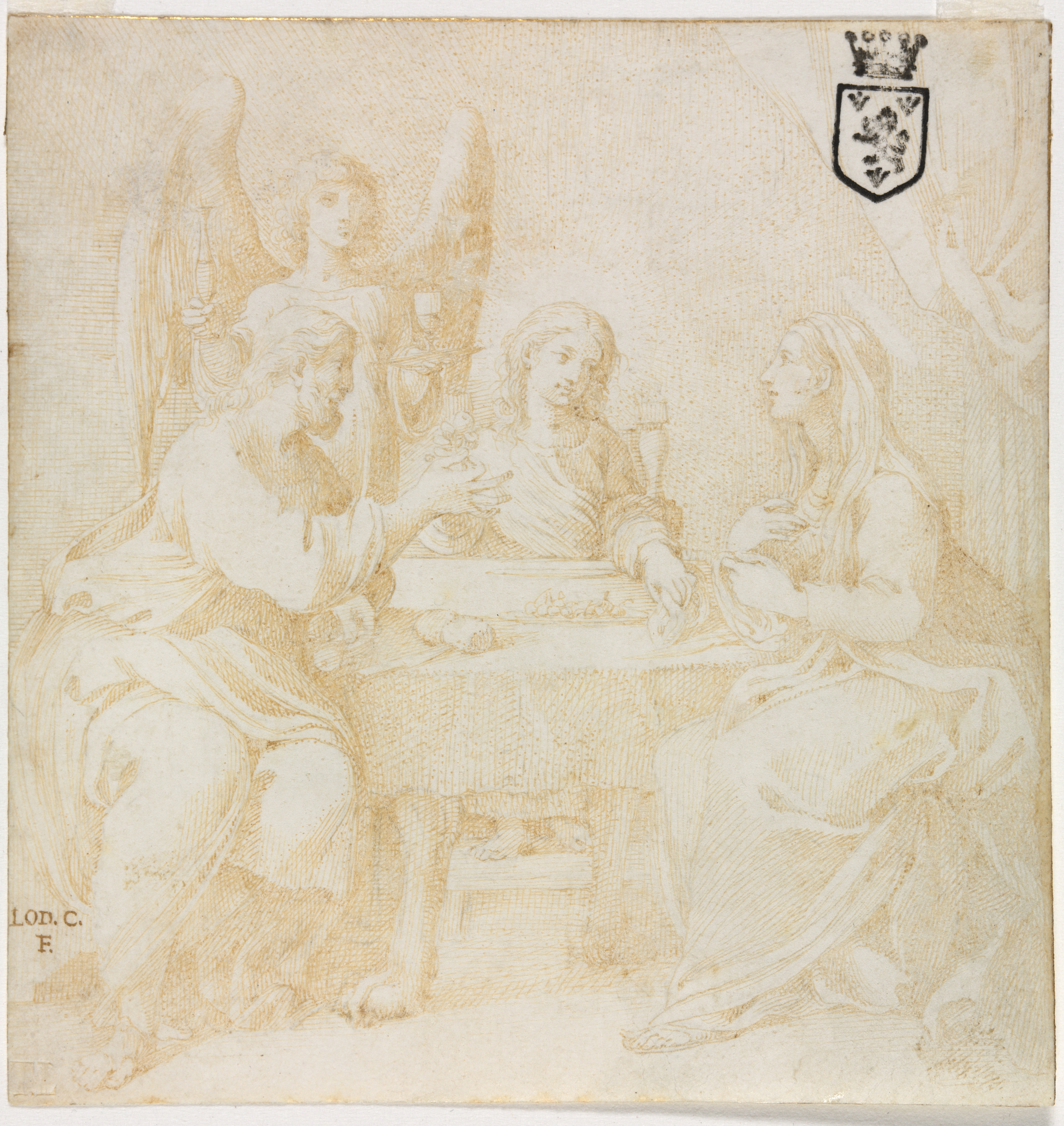 The Holy Family at Table Served by an Angel by Ludovico Carracci: A drawing depicts three people around a table with an angel standing behind. The people are wearing robes. A man and woman sit on either side of a table with a child between them. The woman on the right holds something in her right hand. The man on the left holds a goblet in his right hand. The child in the center looks down. The angel behind them holds a goblet. The drawing is on aged paper with a sepia tone. A shield with a crown atop it appears in the top right corner. A signature appears in the bottom left corner.