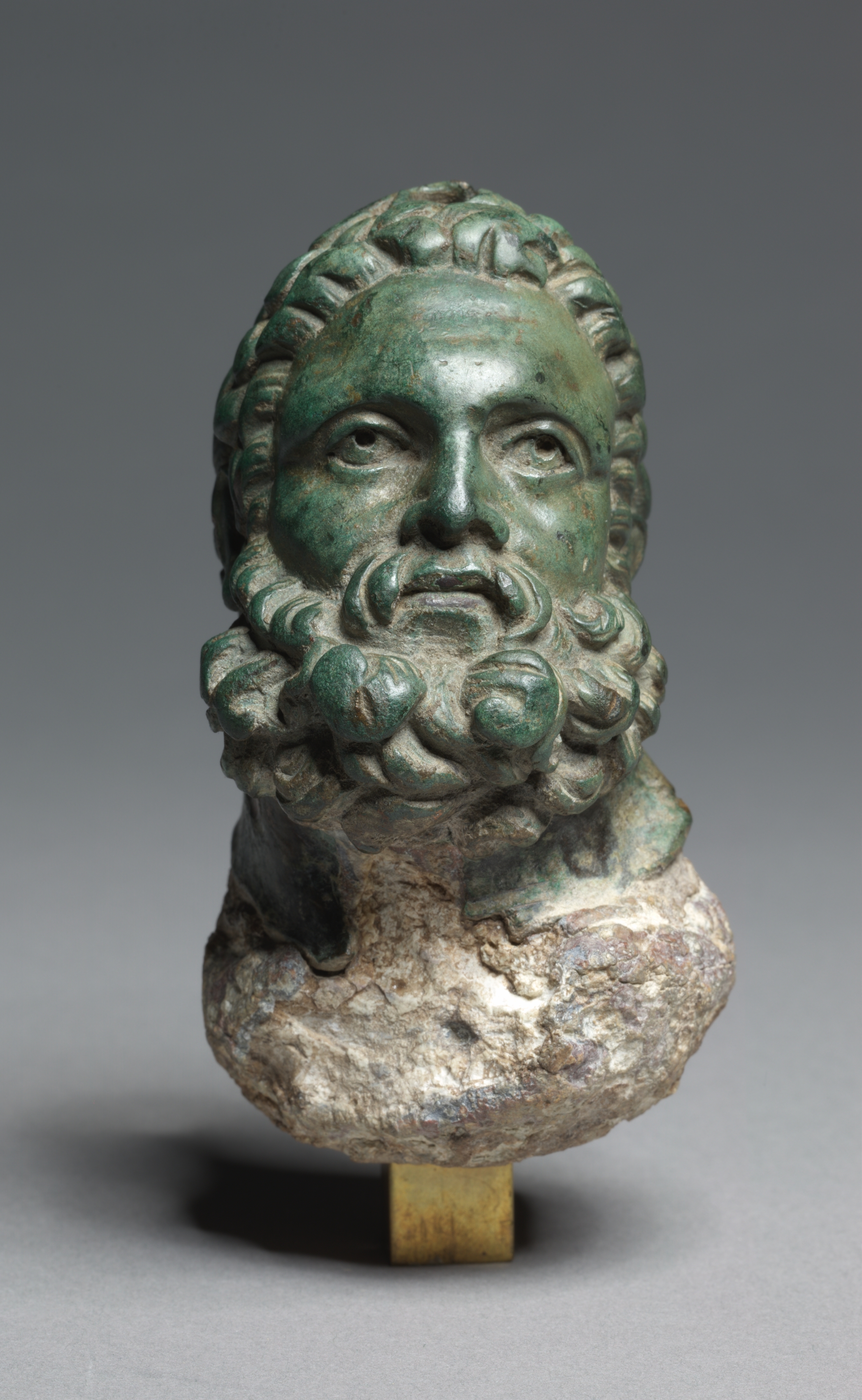 Green and beige sculpture of a man's head. The man has curly hair and a beard. The sculpture ends at the man's chest. The sculpture is on a small gold stand. The man has a mustache. The background is gray. The sculpture has a green patina. The title is "Head of Herakles Refashioned as a Weight" and the artist is unknown.