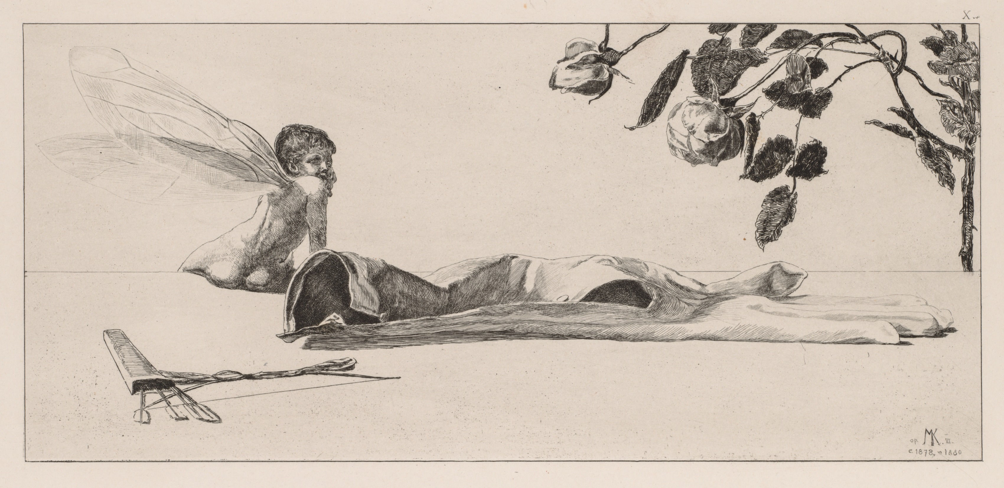 Black and white drawing on beige background. A small figure with wings sits on the left side behind a prostrate left hand and arm. The small figure faces right. A glove lies on the ground. A plant with leaves and buds hangs from the top right. The artist's initials are in the bottom right.