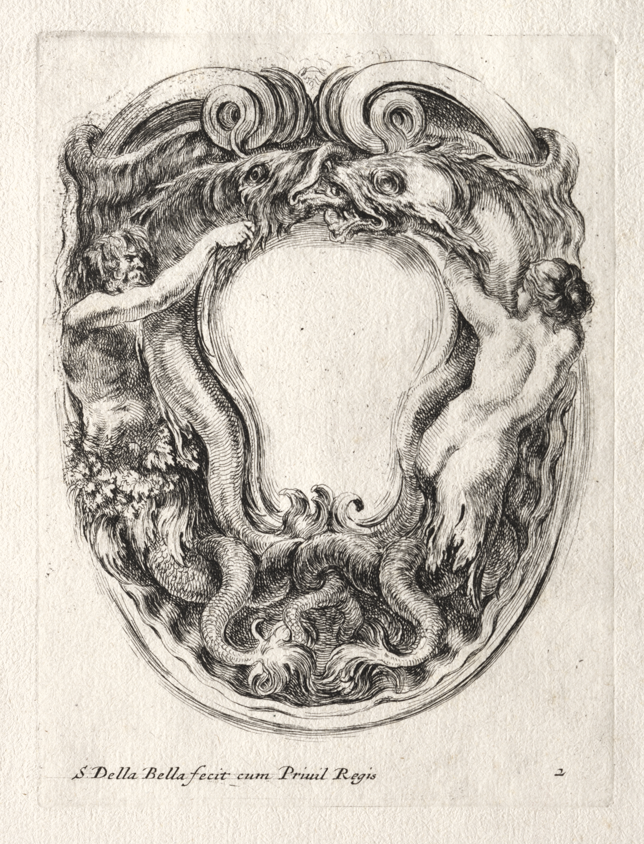 Oval frame with empty center, surrounded by wavy lines and scrolls at top. Two nude figures, one on each side, holding frame. Figure on left has short hair, and foliage around waist; figure on right has short hair and arm extended. Text at bottom reads "S Della Bella fecit cum Priv Regis".