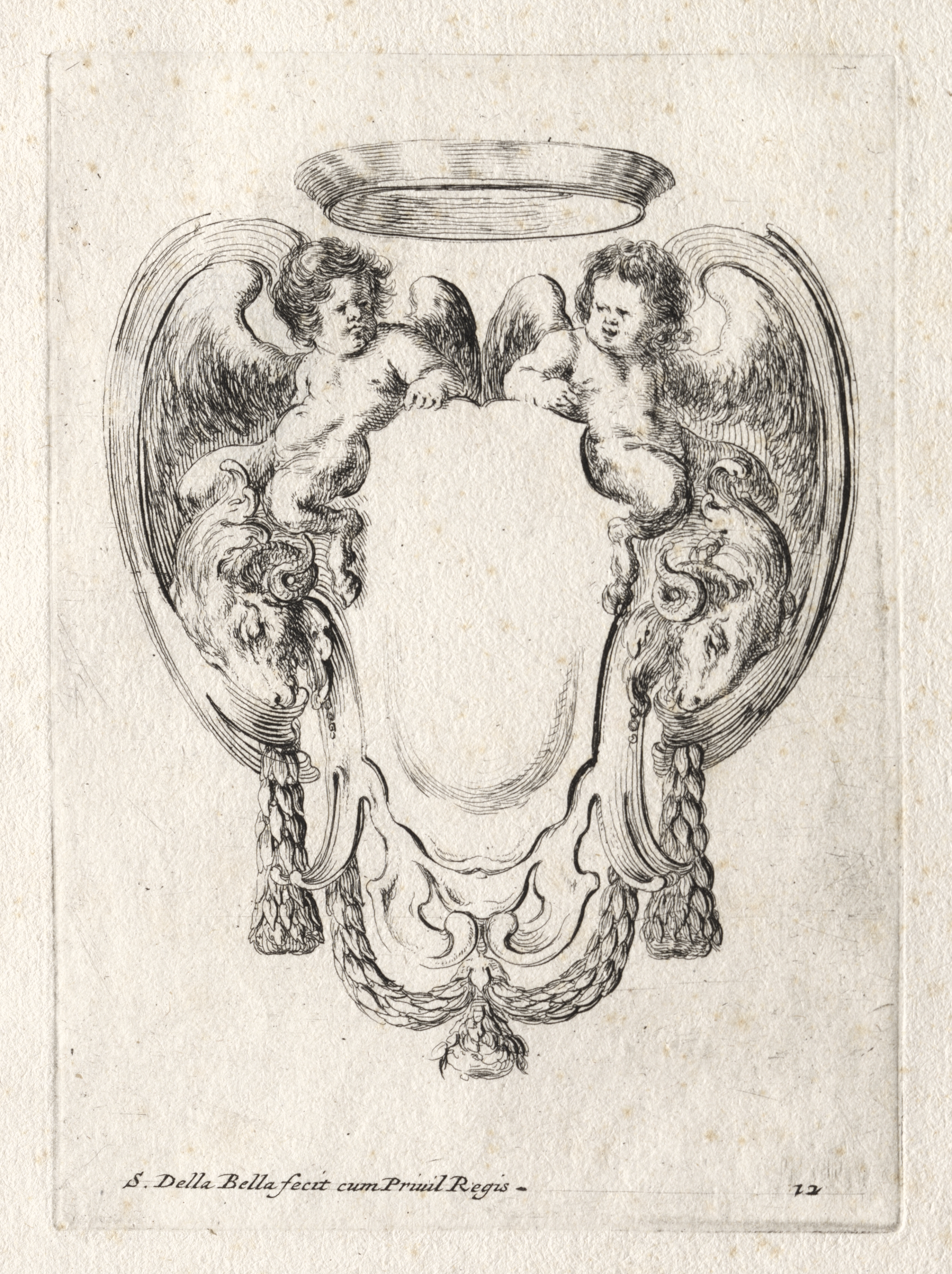 A black and white drawing of an ornate cartouche with two cherubs on top. The cartouche is symmetrical and ornately decorated with scrollwork on both sides. The scrollwork on each side includes a lion's head and a tassel hanging below. The top of the cartouche features a flat, wide ring or halo-like structure with no shading inside to indicate it is not 3D. Two cherubs sit on top of the cartouche, one on each side, both with curly hair and wings; they are leaning on the cartouche. The cherub on the left has their right arm resting on the cartouche and their left arm in front of their body. The cherub on the right has their left arm resting on the cartouche and their right arm in front of their body. The background of the drawing is a textured, off-white color with darker spots throughout. The drawing is rectangular in shape with a thin line border around the edge. The bottom of the drawing features a line of small text in a foreign language. The number "72" is printed on the bottom right side. The drawing appears to be by Stefano Della Bella, titled "New Model for a Cartouche".