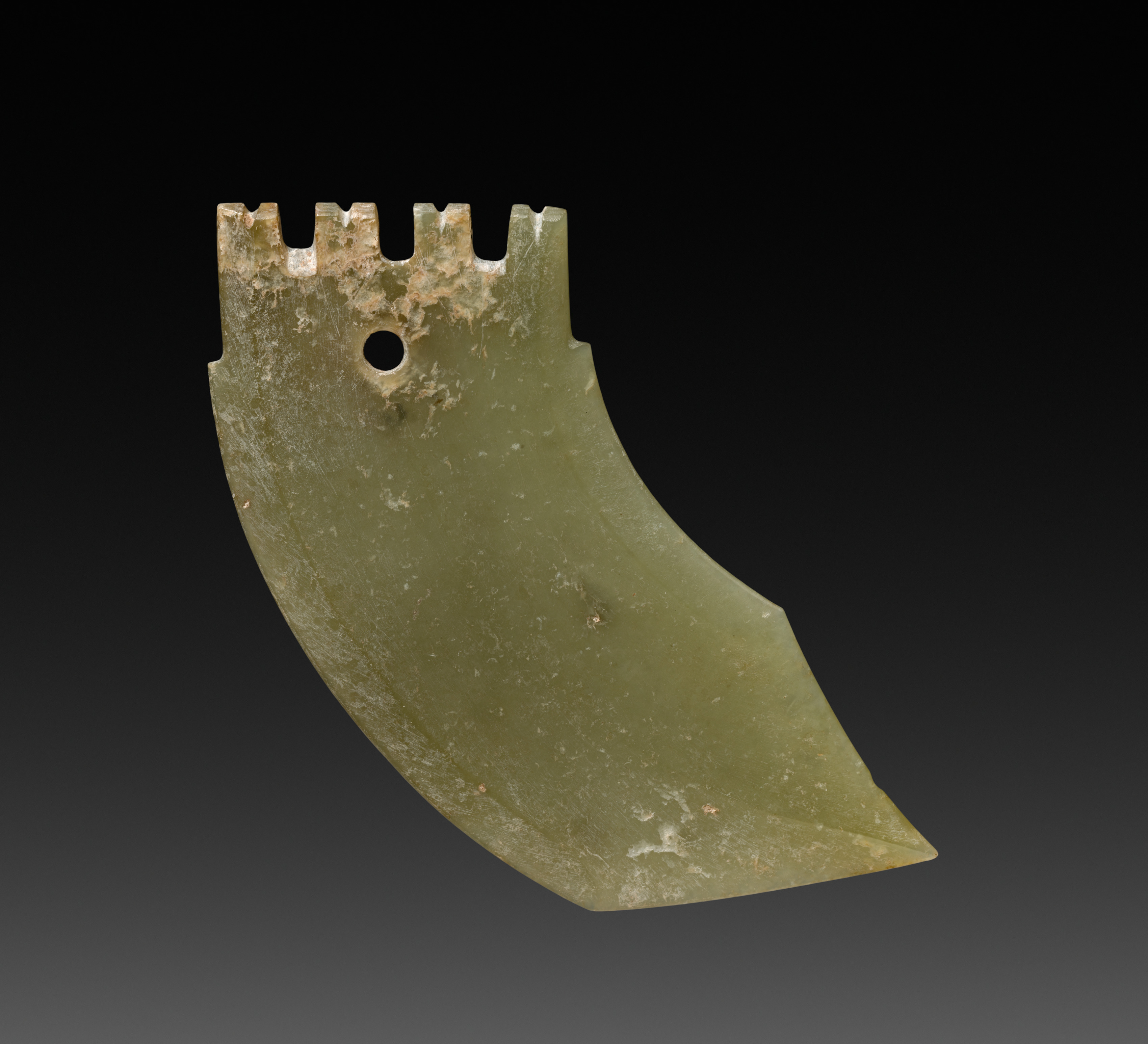 Green jade pendant in the shape of a dagger-axe, featuring a curved blade with a pointed tip and a straight edge; the top has a flat section with five notches and a circular hole.
