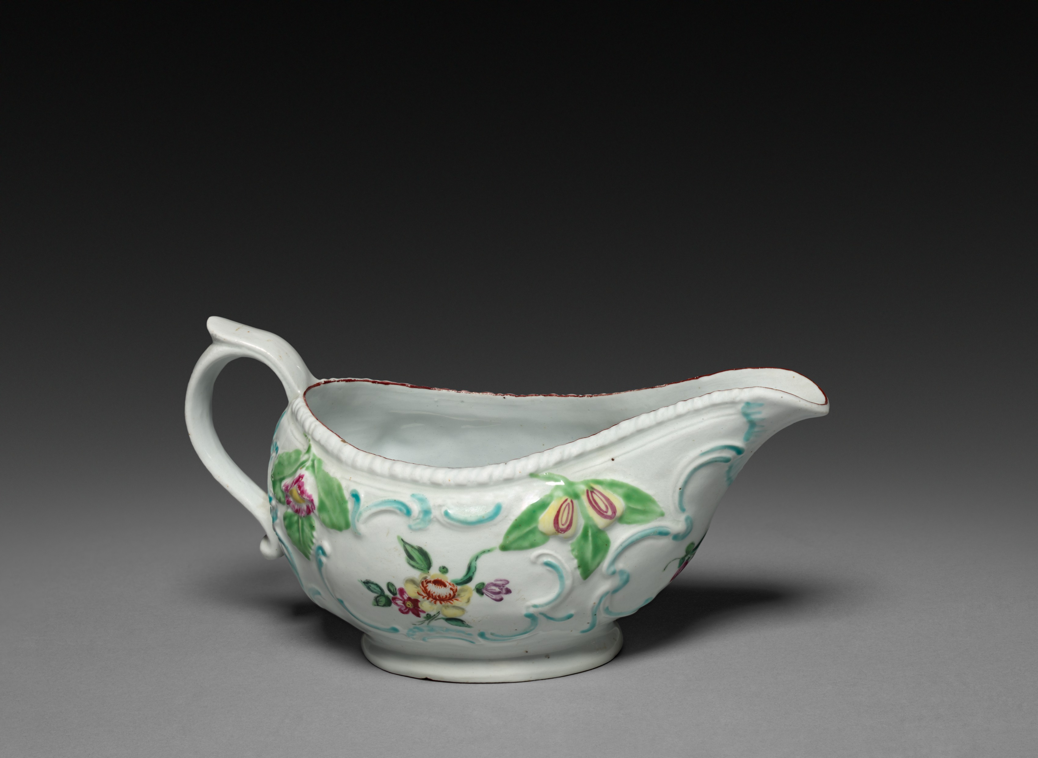 White porcelain sauce boat with a handle on one side and a spout on the other. The body of the boat is decorated with a floral pattern featuring green leaves, purple, pink, and yellow flowers, and blue swirling lines. The base of the boat is round and flat. The rim has a small, decorative edge. The boat sits on a gray surface with a dark background. It is a piece produced by Derby Porcelain Factory, titled "Sauce Boat".