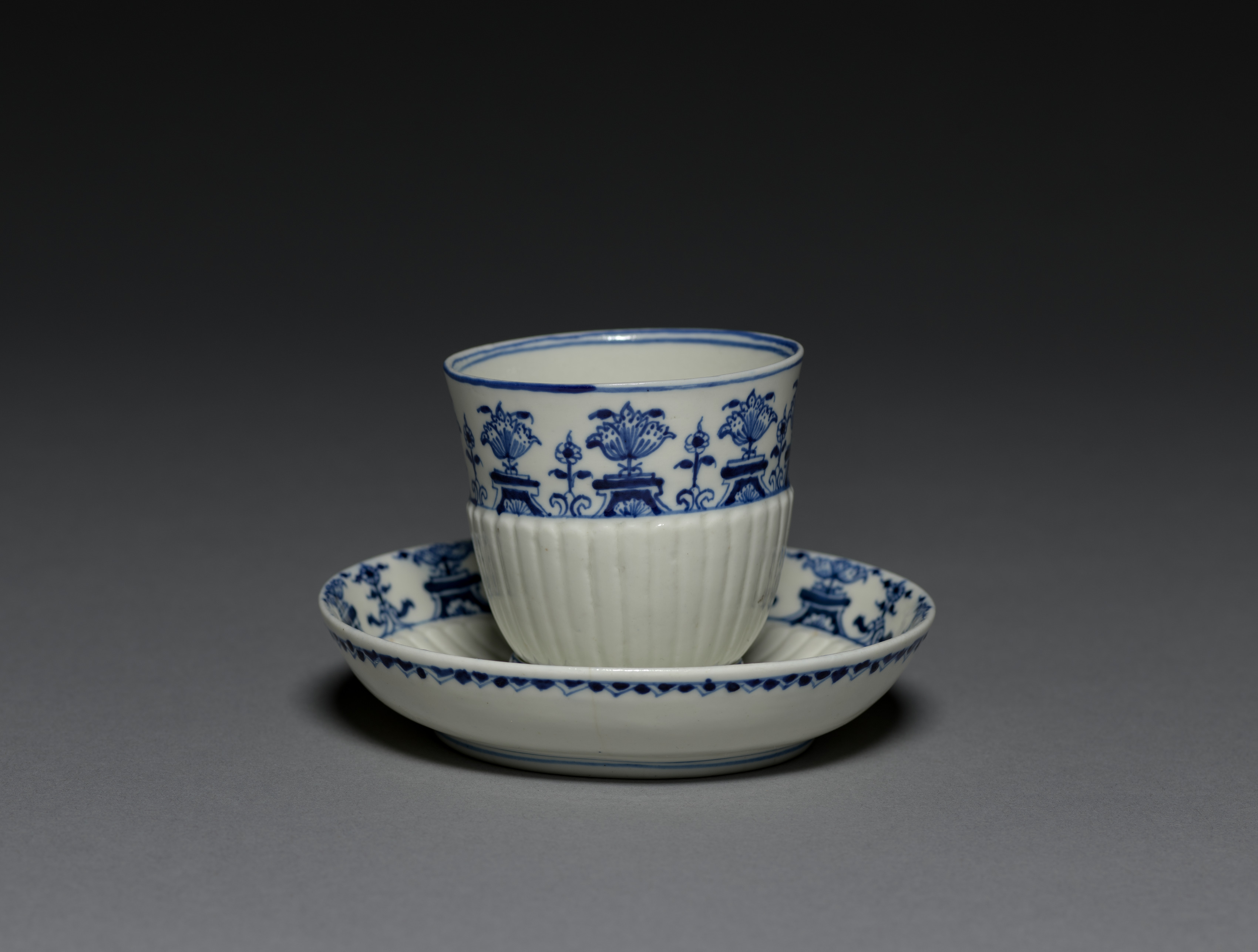 White porcelain cup and saucer with blue designs. The cup has a ribbed lower section and a flared top with blue floral pattern around the rim. The blue pattern on the cup includes urns and plants. The saucer has a blue design around the rim. Cup and saucer sit on a gray surface with a dark background.